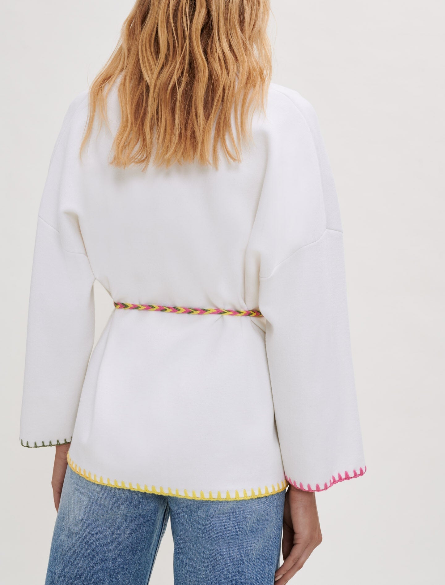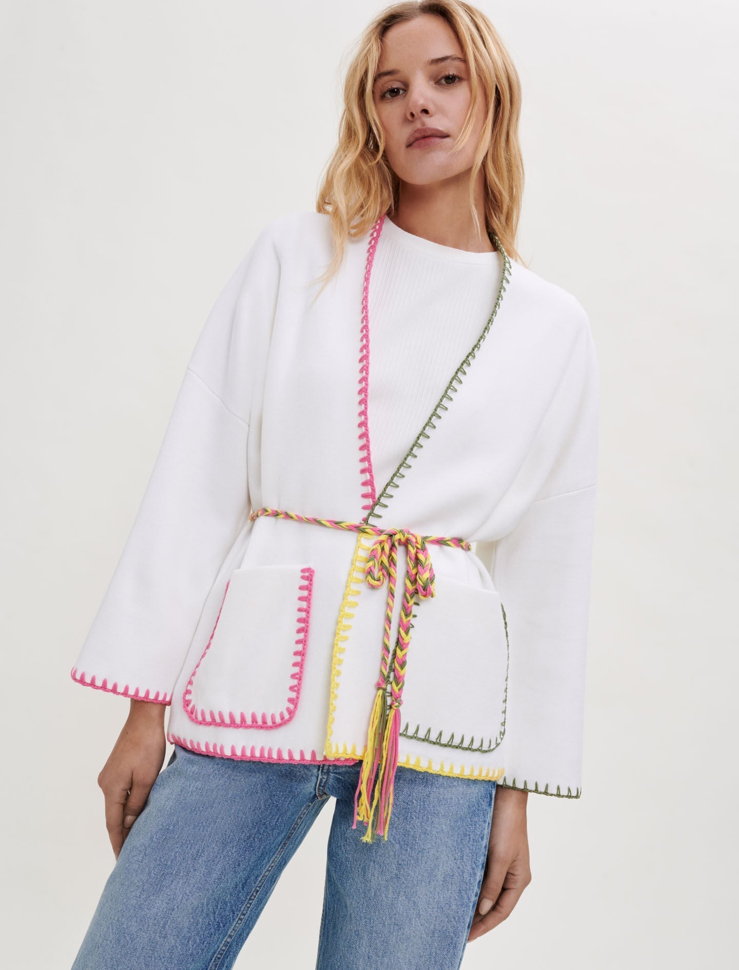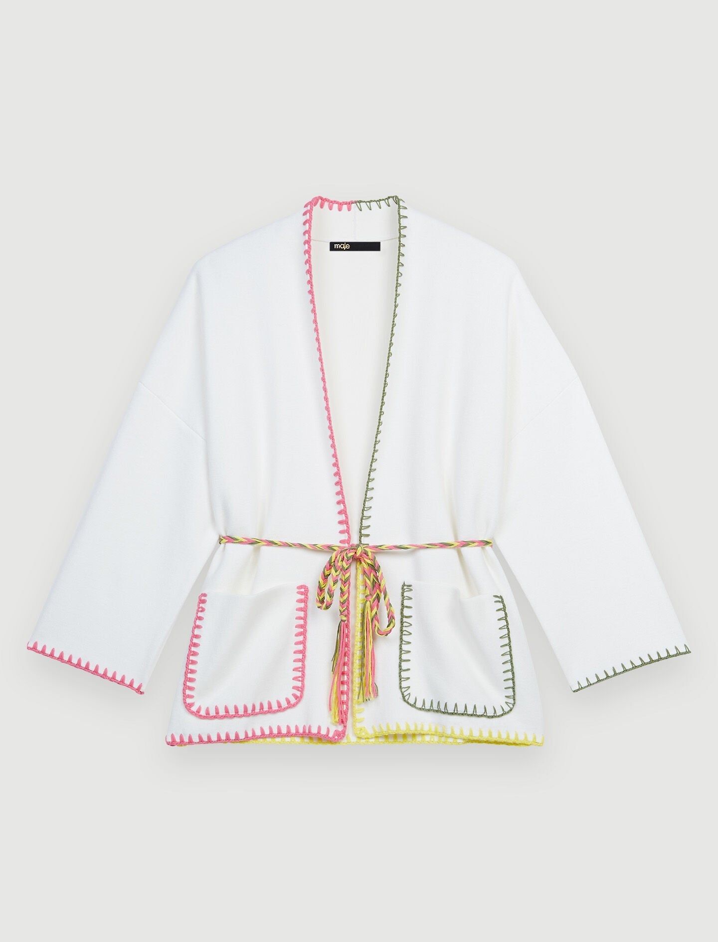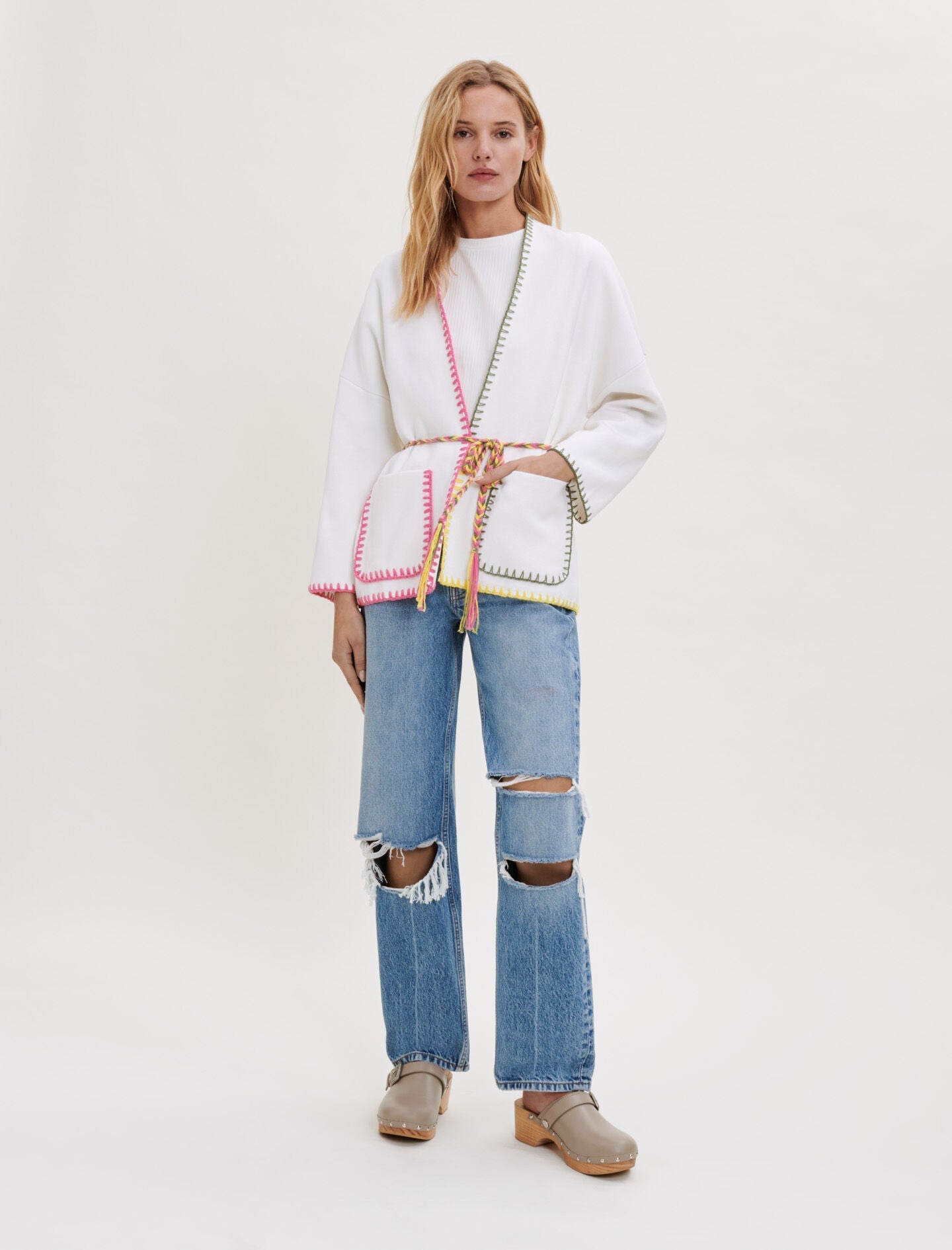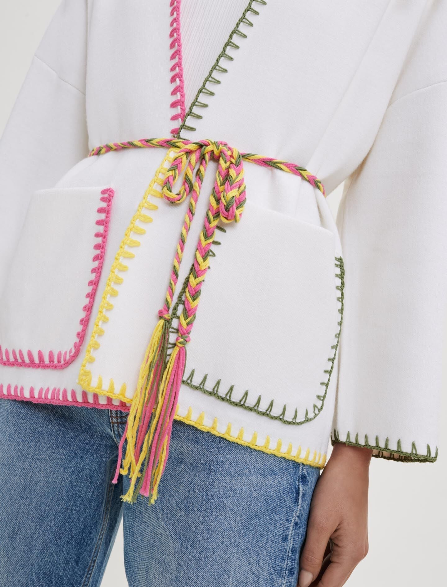 Straight-cut midi cardigan. Slightly stretch knit. Long, straight sleeves. V neckline. Removable braided belt. Coloured crochet stitching around edges, pockets and hem of sleeves. Two patch pockets on front.
