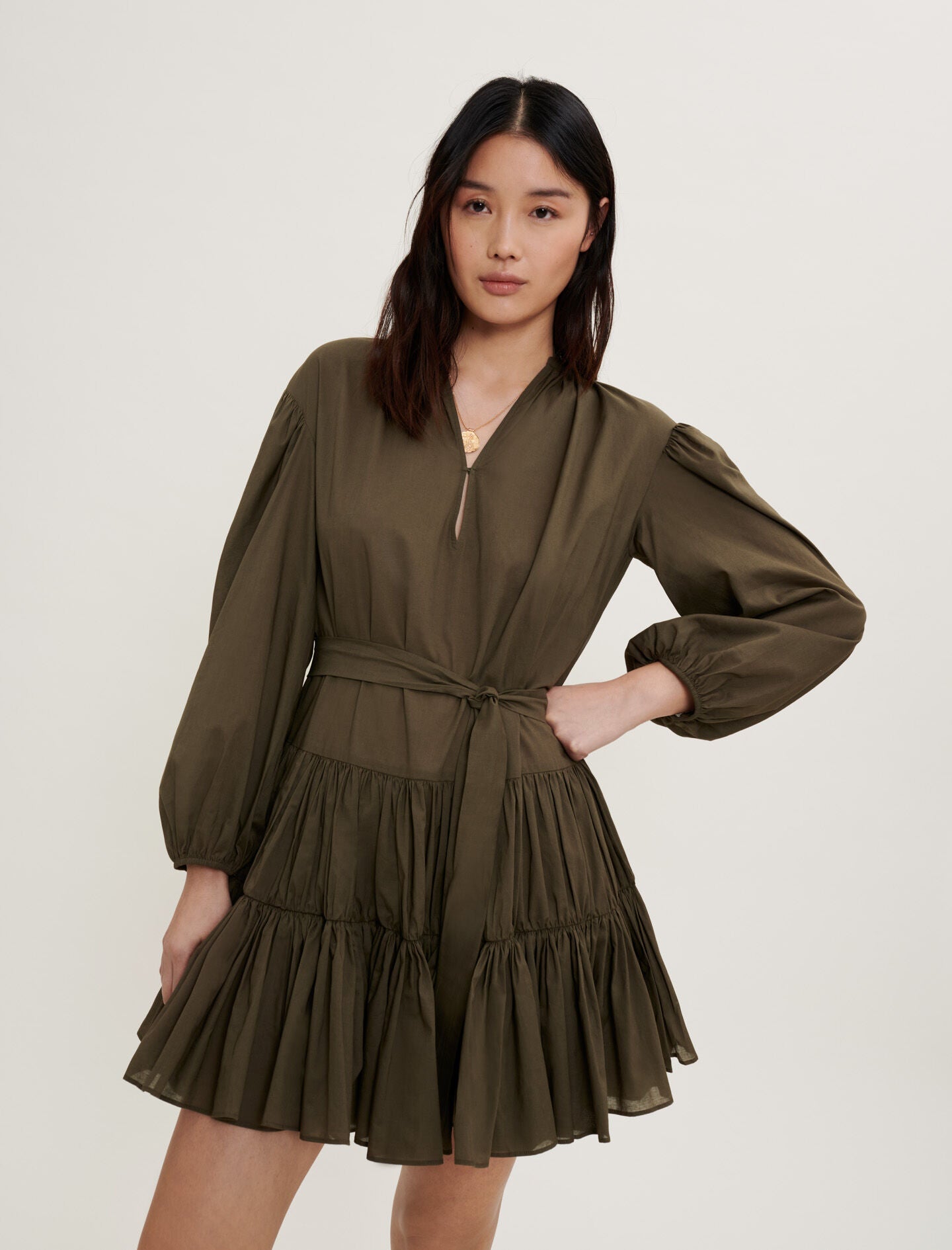Short, loose-fitting dress. Plain-coloured cotton. Long, loose-fitting sleeves, gathered and elasticated at the bottom. Round neckline with V-shaped opening in the front. Removable belt. Pleats and gathers on the bottom. Day dress.