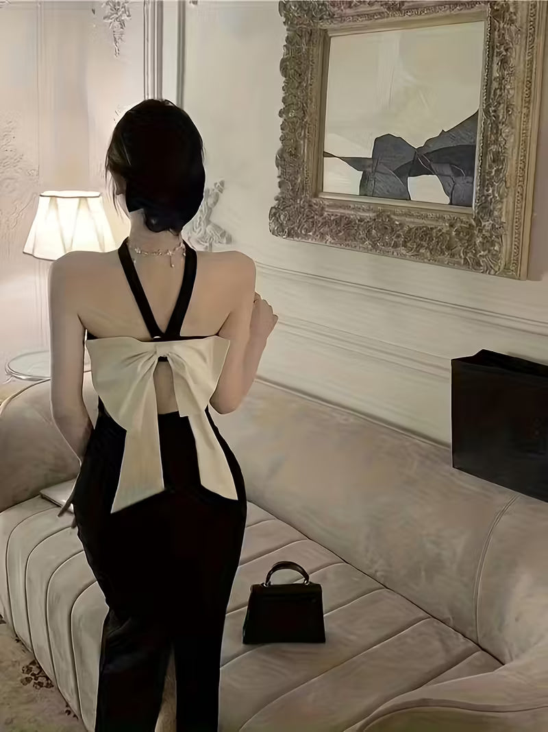 [Black Bodycon Dress] Sleeveless Backless Elegant Black Bodycon Dress | Halter Neck with Bow Detail, Split Thigh Midi for Women, Perfect for Spring/Summer, Tight Fitted