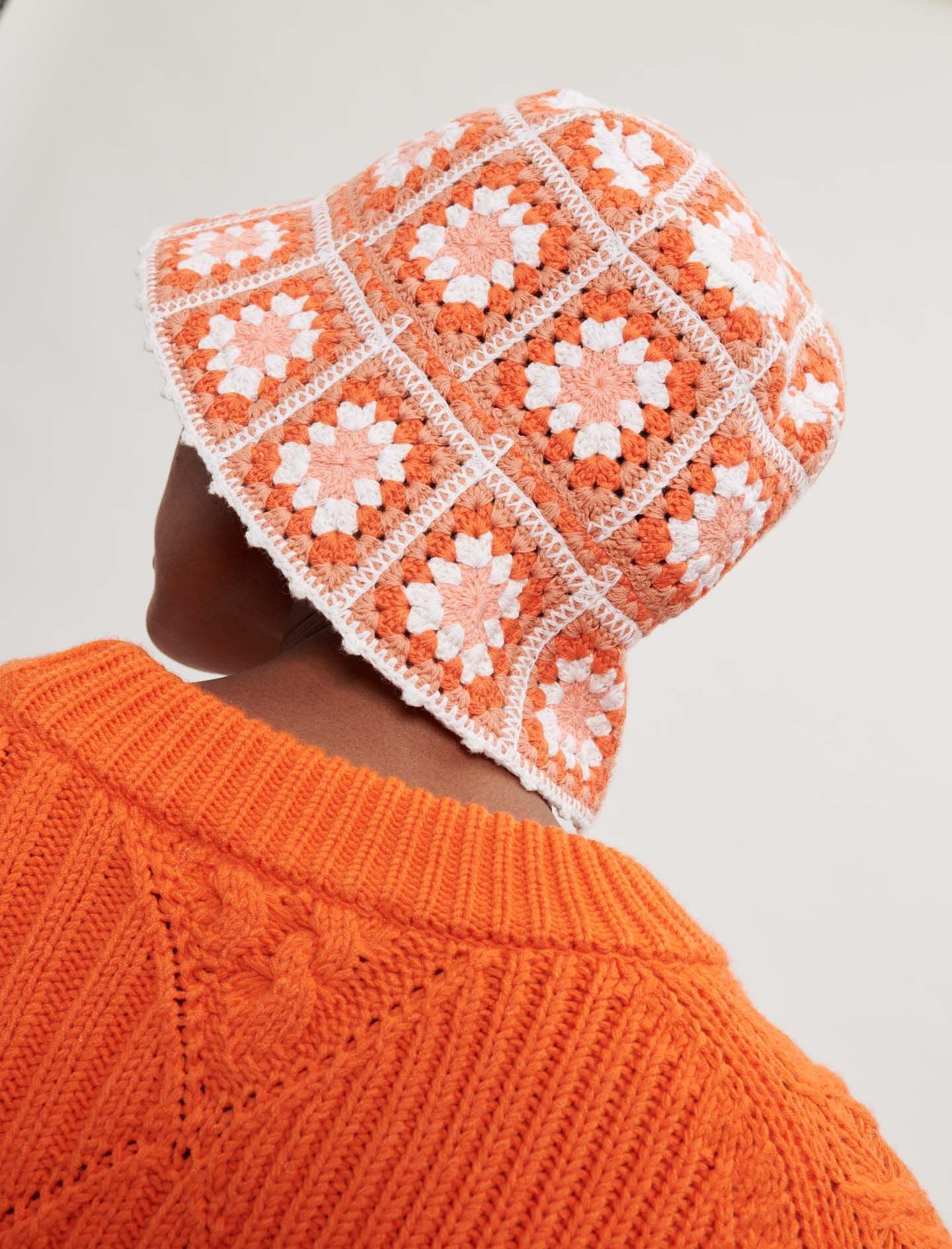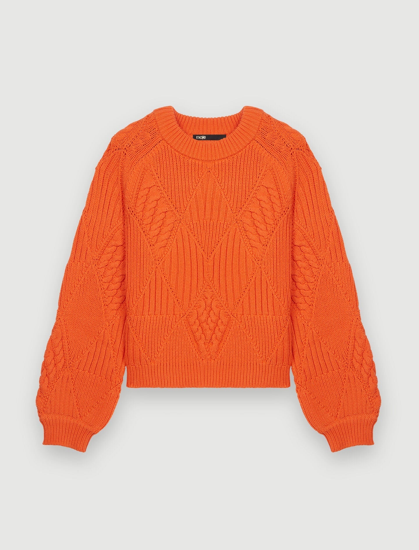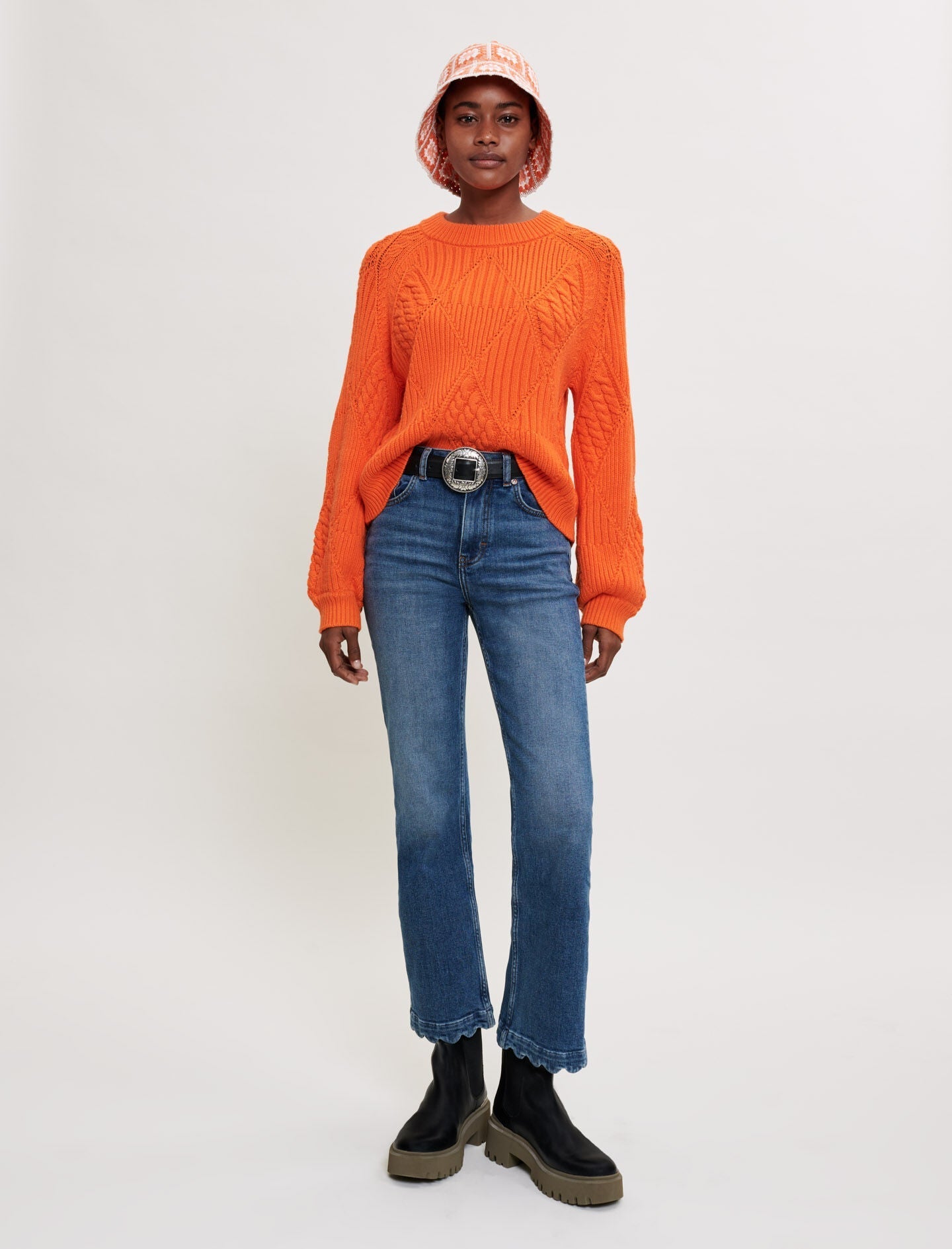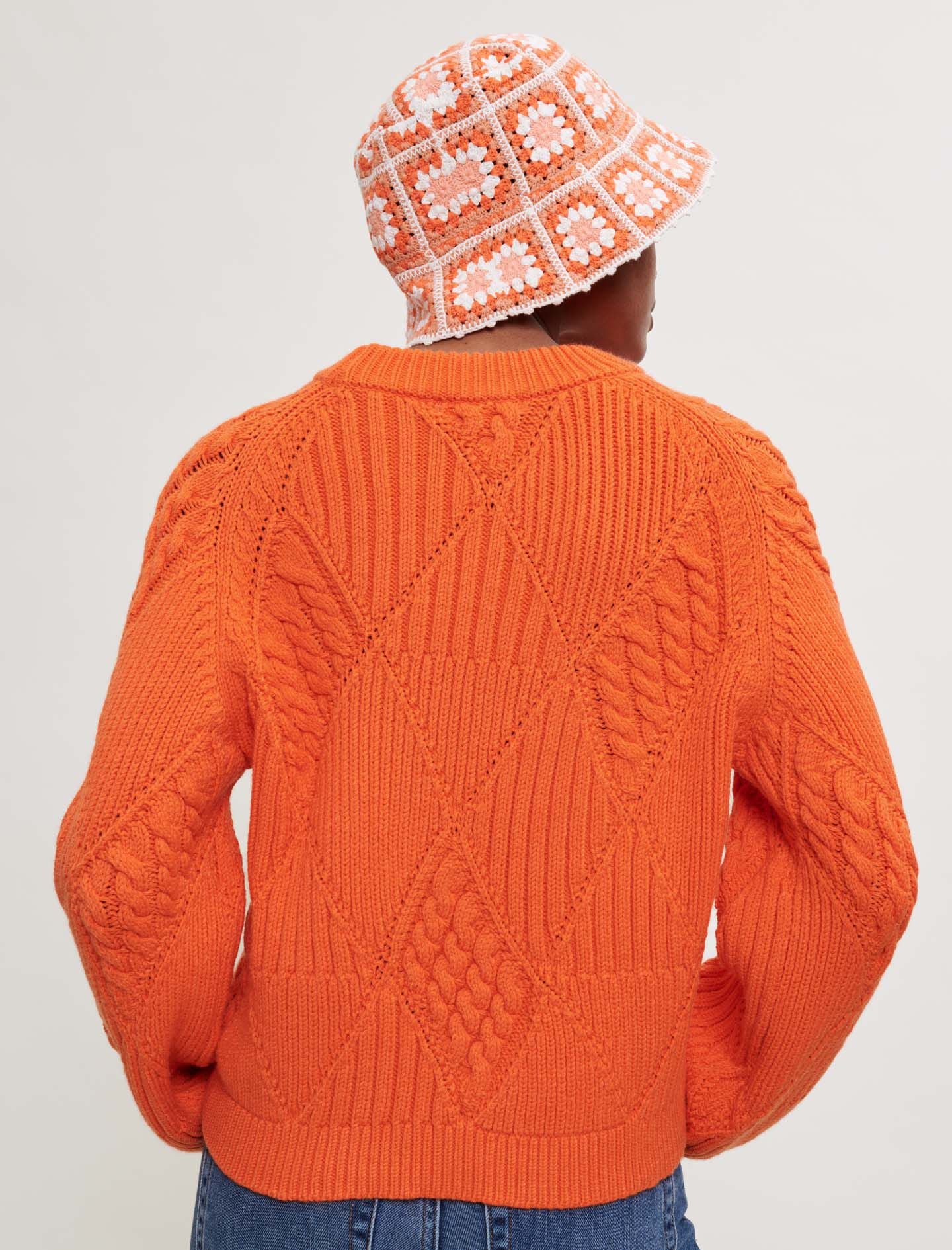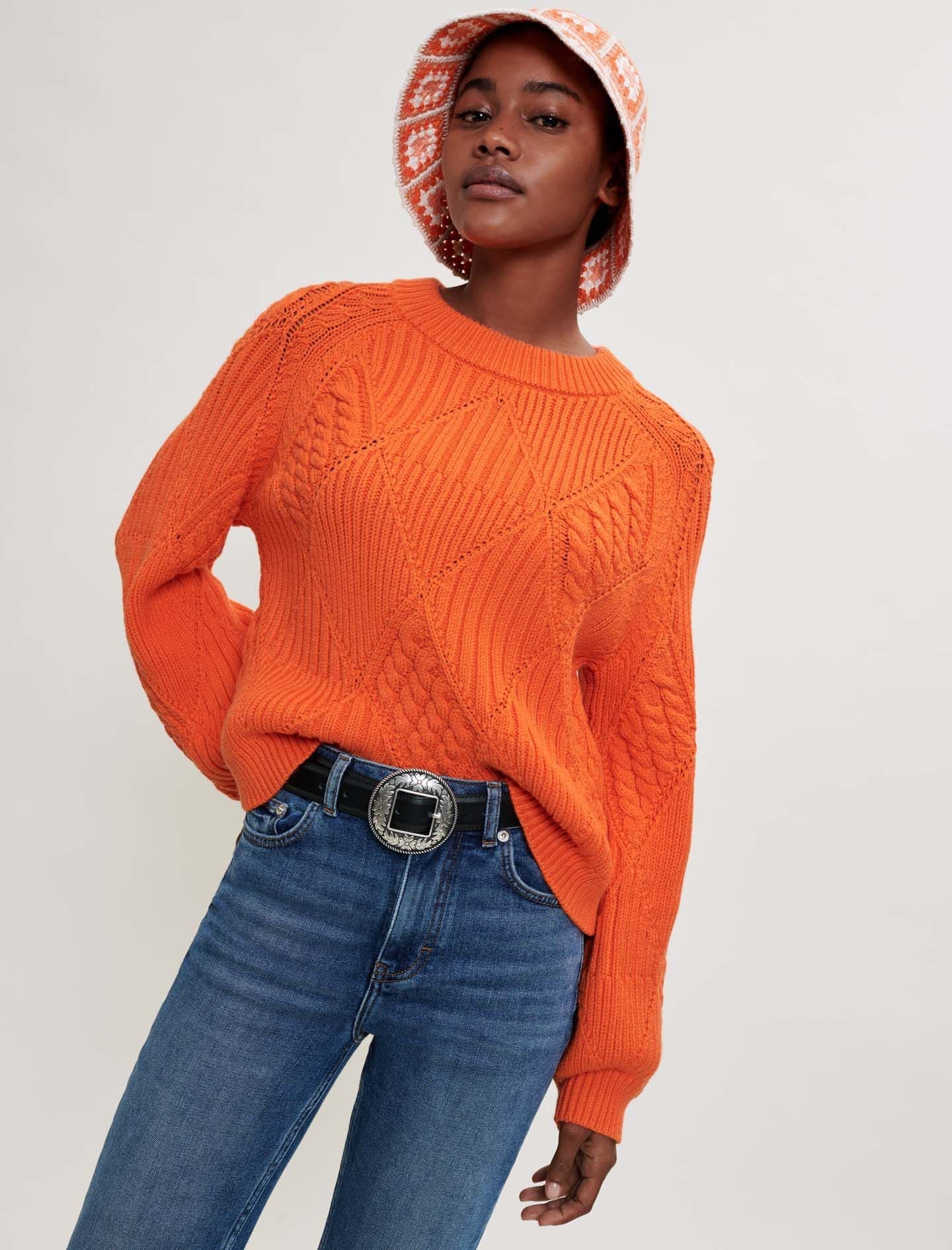 Thick, loose orange sweater. Long, loose sleeves with ribbed trims. Viscose braided knit fabric. Round neckline.