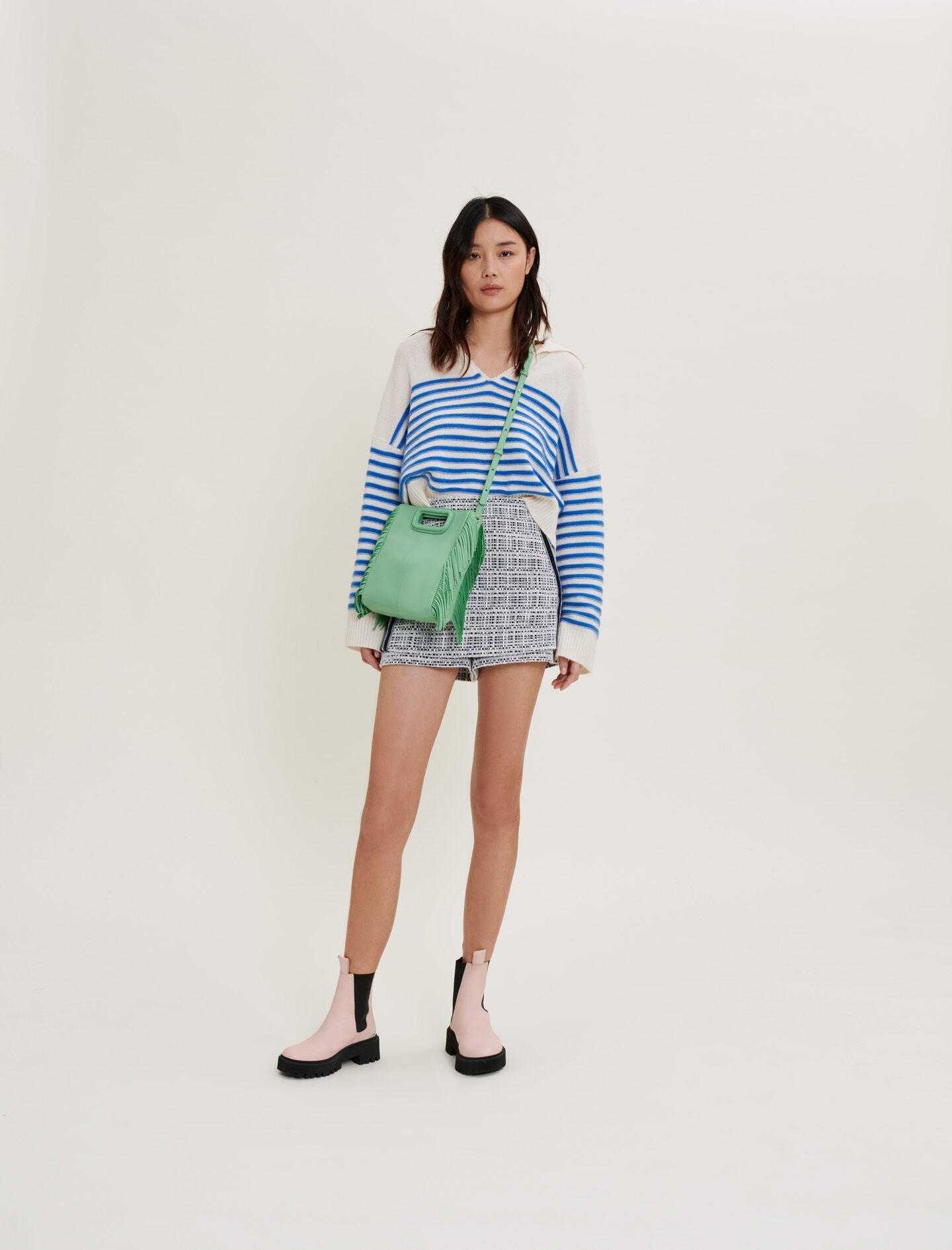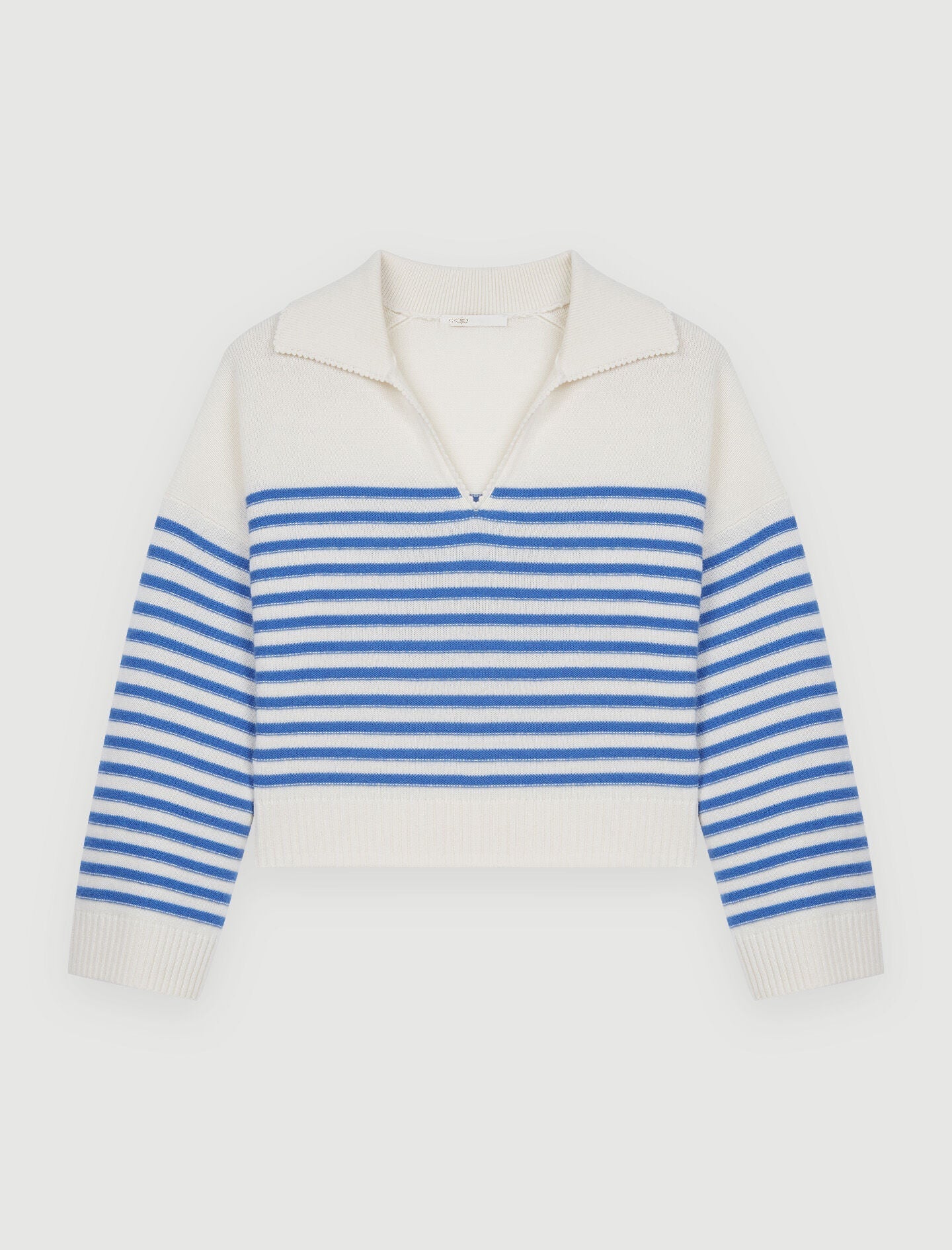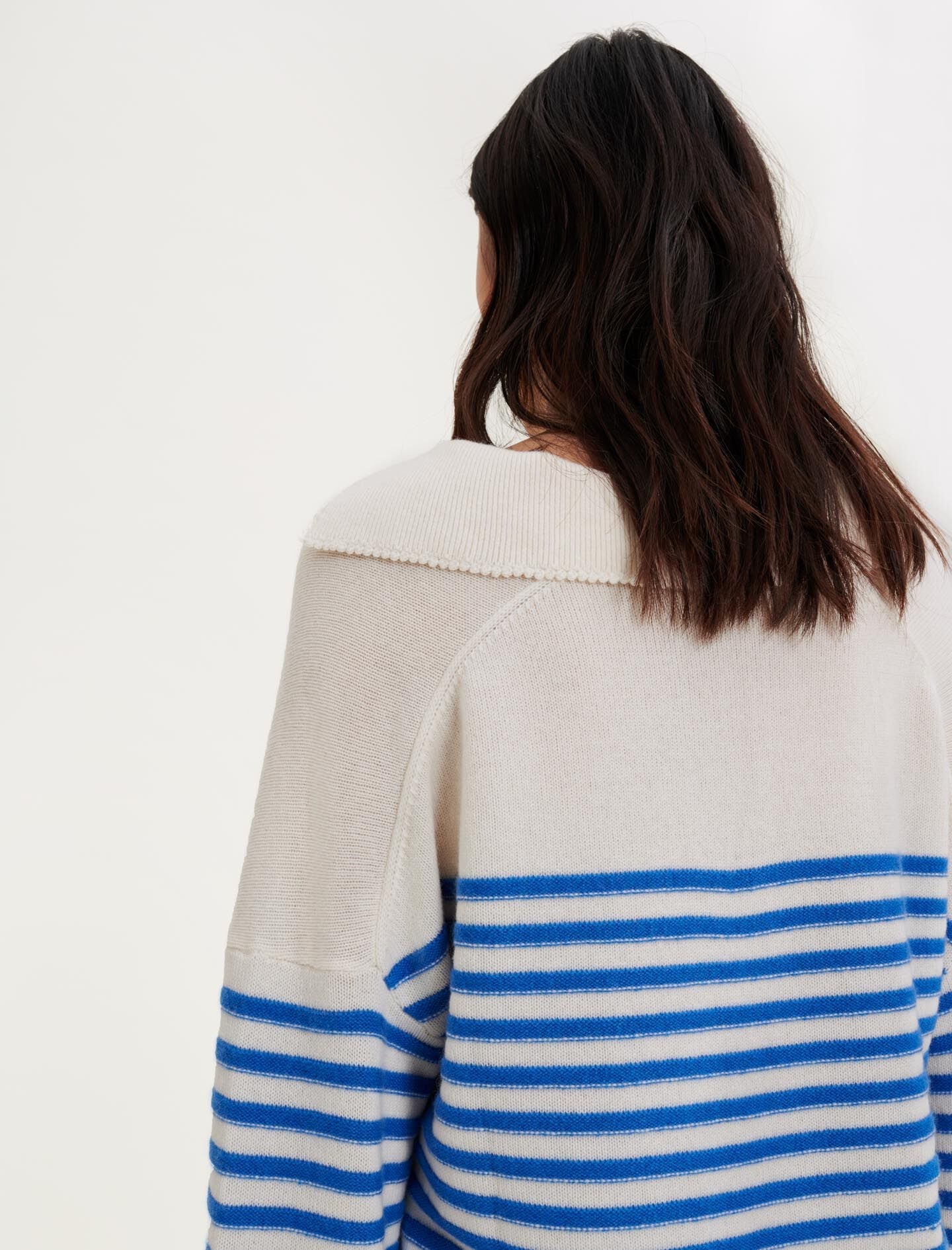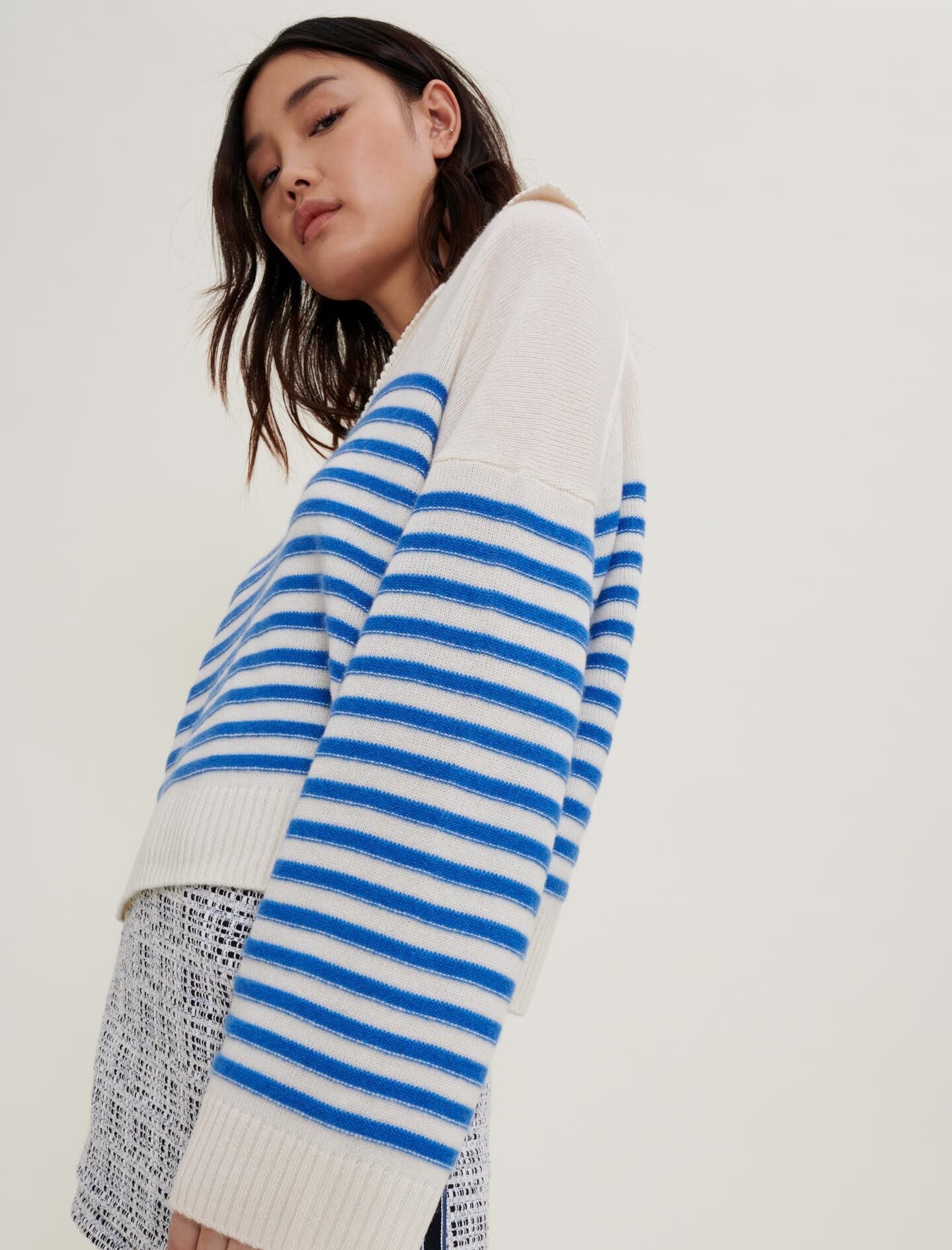 Mid-length, loose-fitting cashmere jumper. Contrasting stripes. Long, wide sleeves. Neck opens slightly in a V. Collar with button and crochet details. Can be worn with this season’s jeans to complete the look.