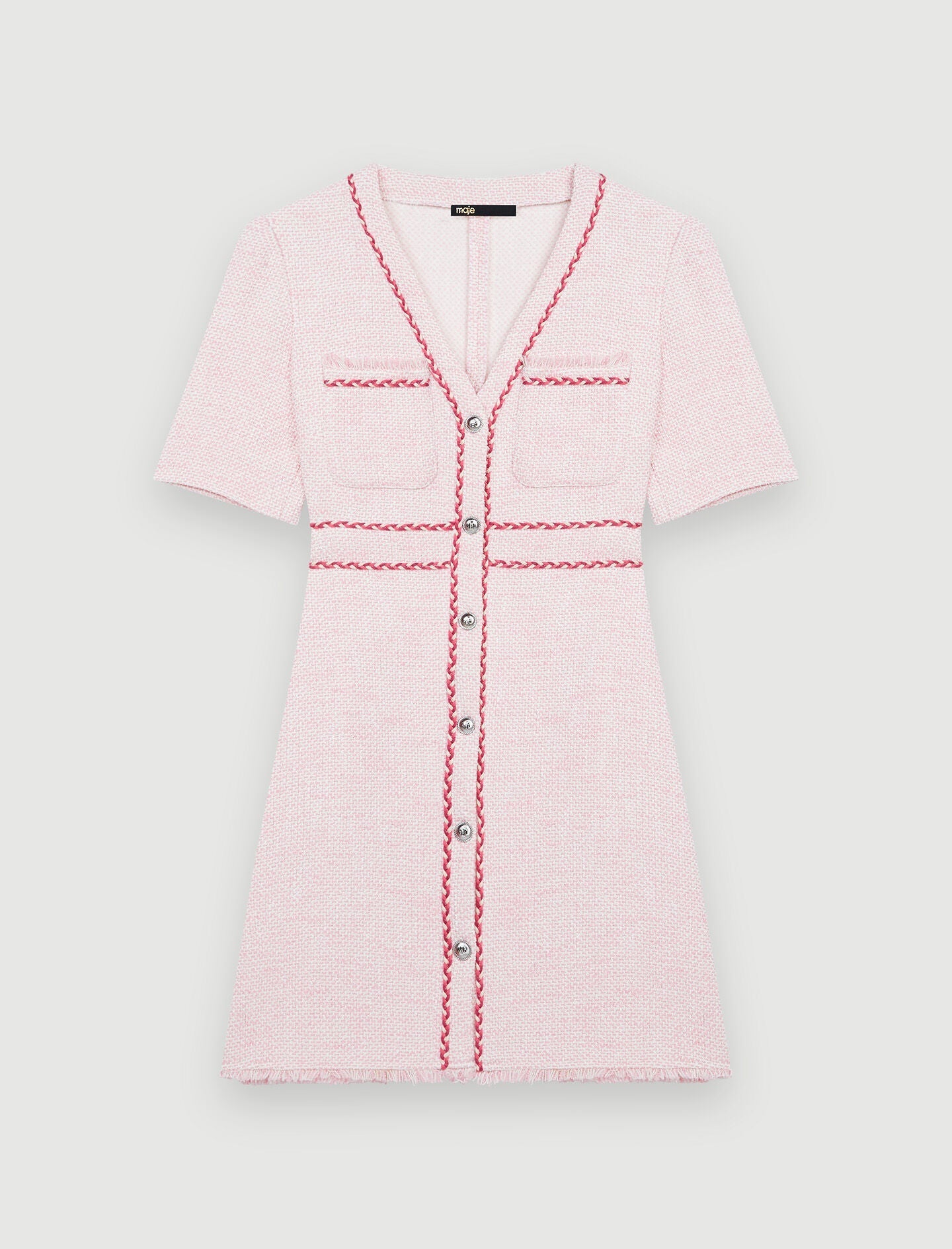 Short, straight-cut tweed dress, slightly fitted at waist. Short, straight sleeves, V neckline and metal buttons with Maje logo on front. Two pockets on chest. Braided trim. Perfect as workwear.