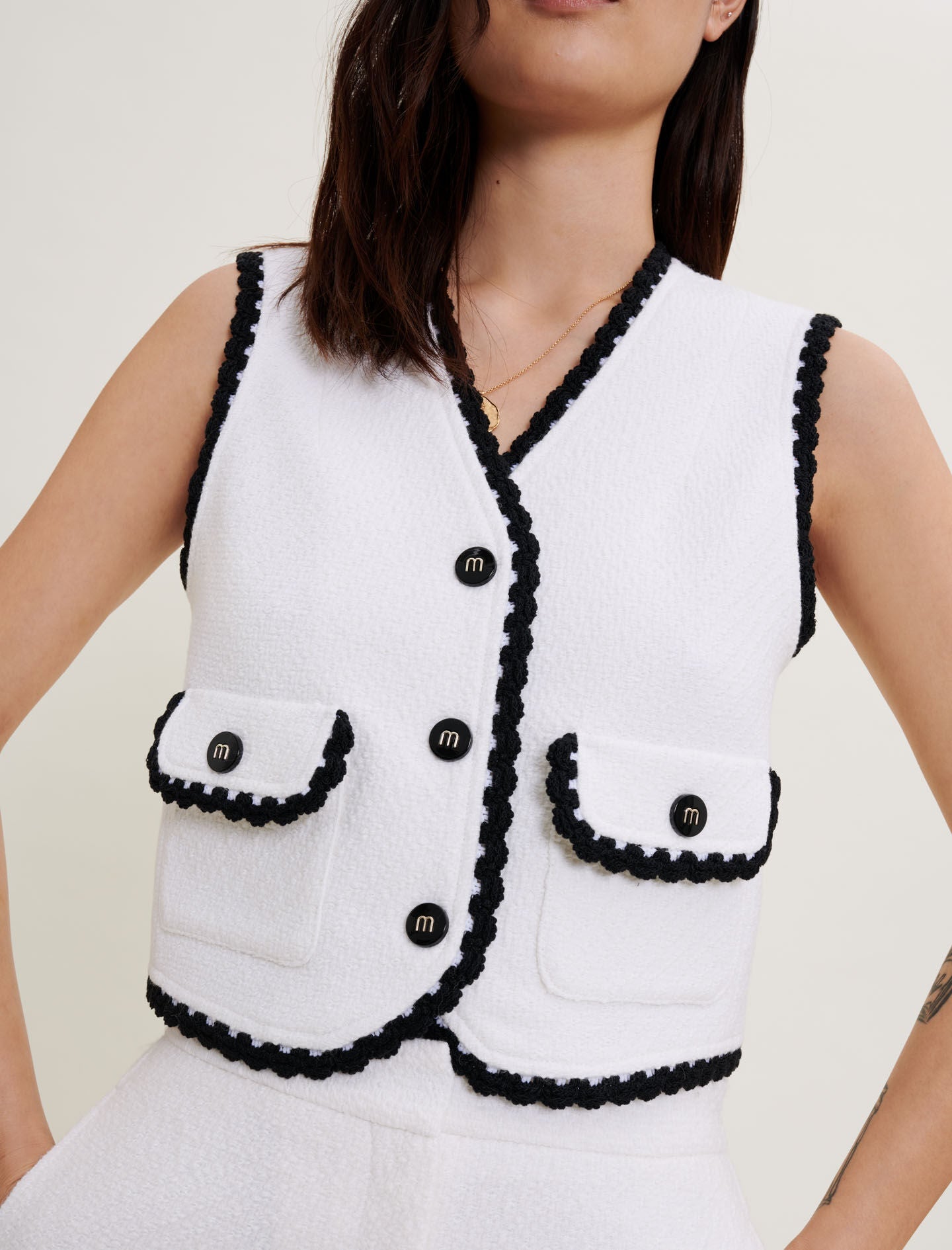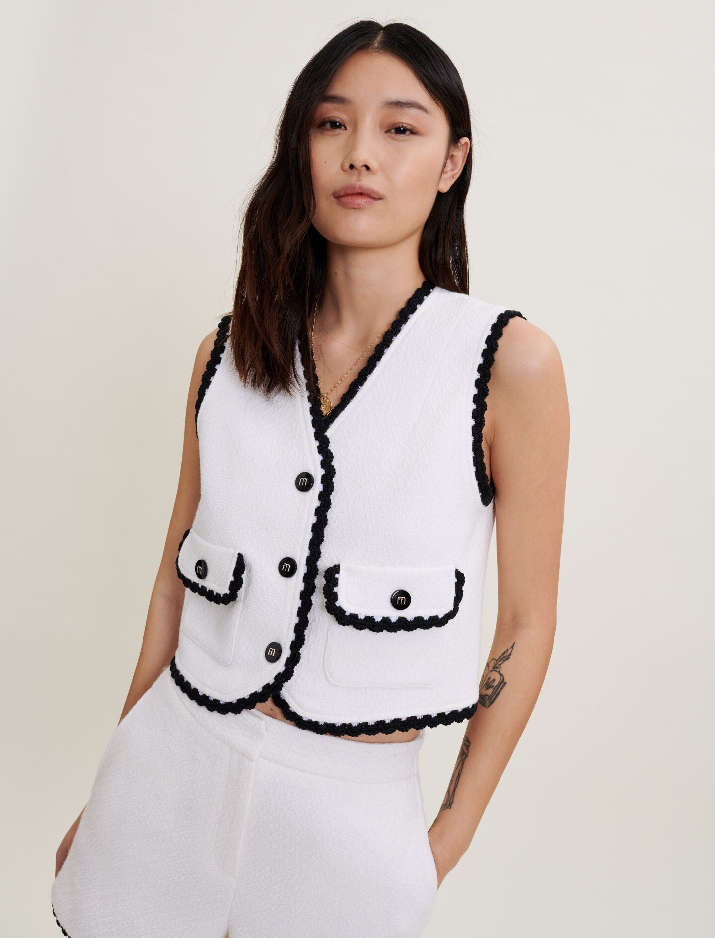 Mid-length, straight-cut waistcoat. Plain ecru tweed with a small textured black pattern. Fully lined in viscose. V-neck. Two flap pockets on the front. Decorative buttons with contrasting Maje logo. Contrasting crochet trims.