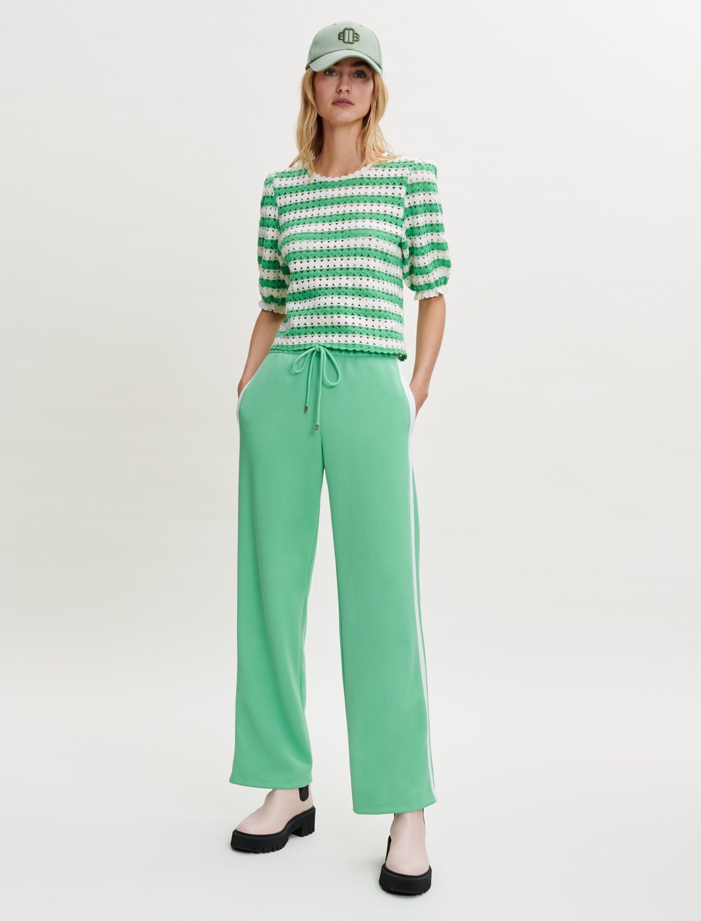 Straight pullover with short, wide sleeves. Green and white striped crochet knit. Round neckline.