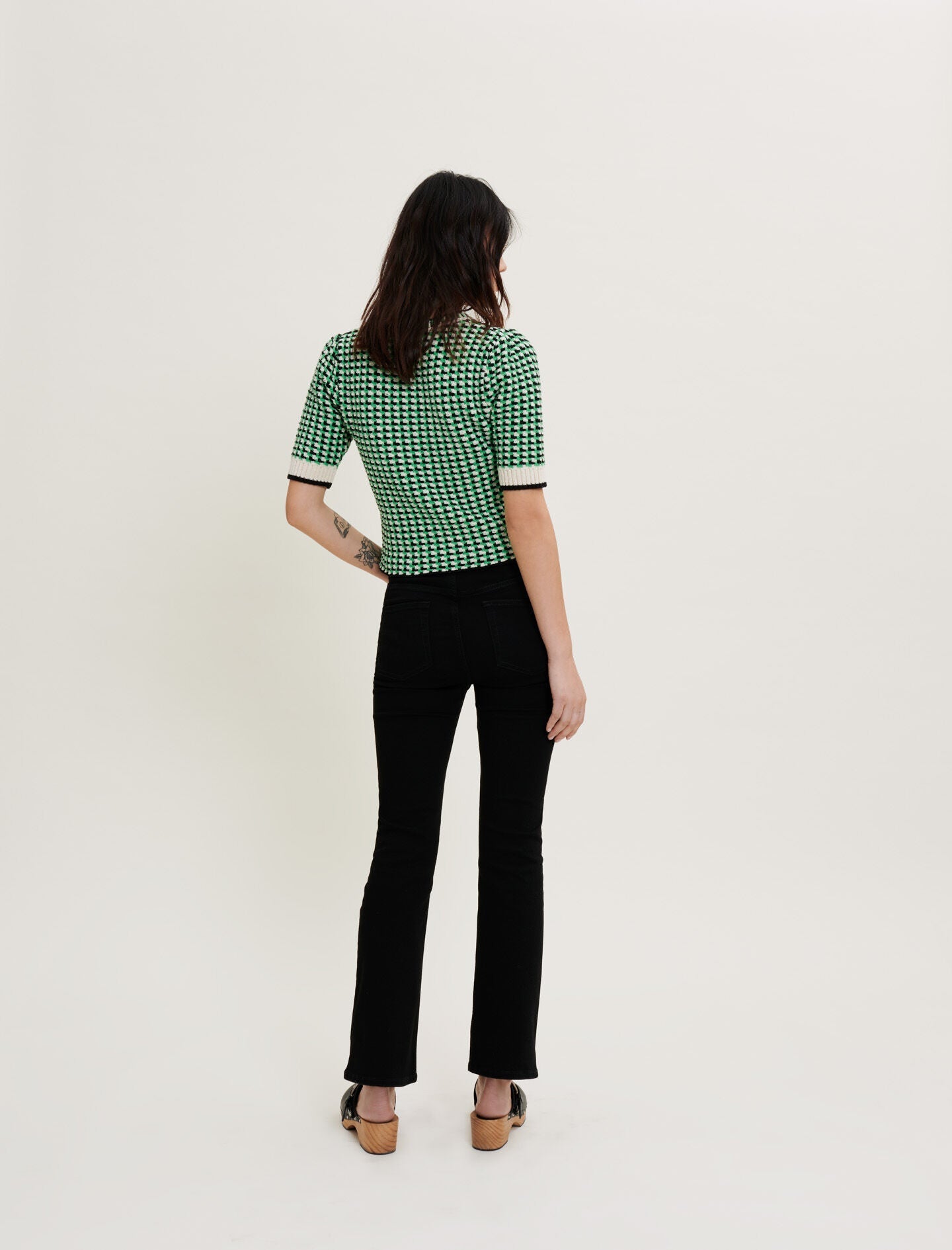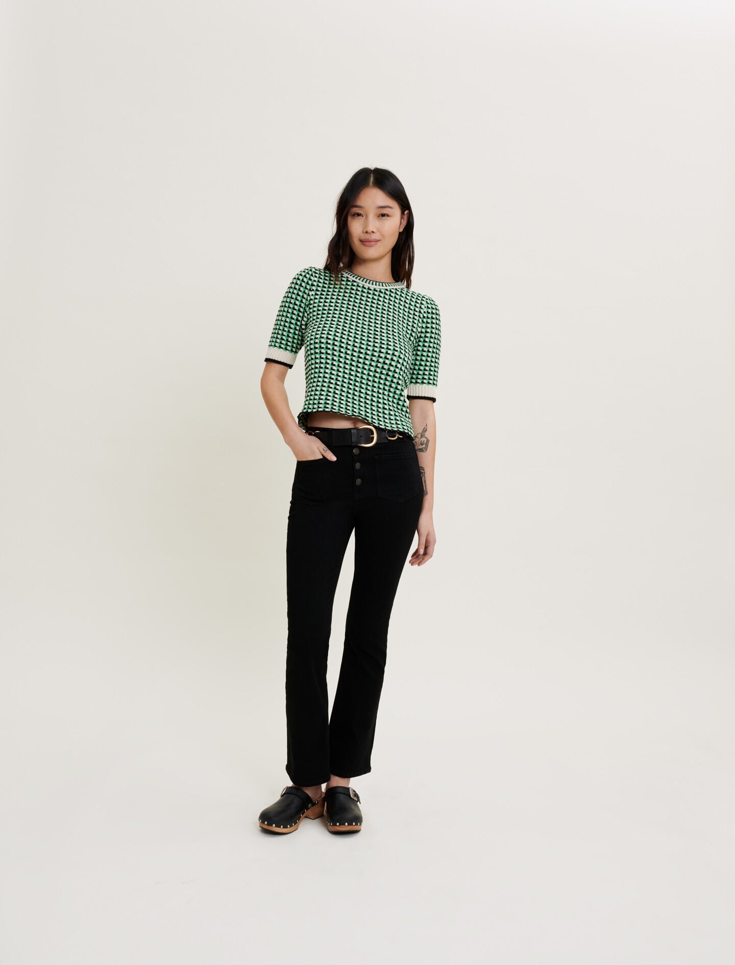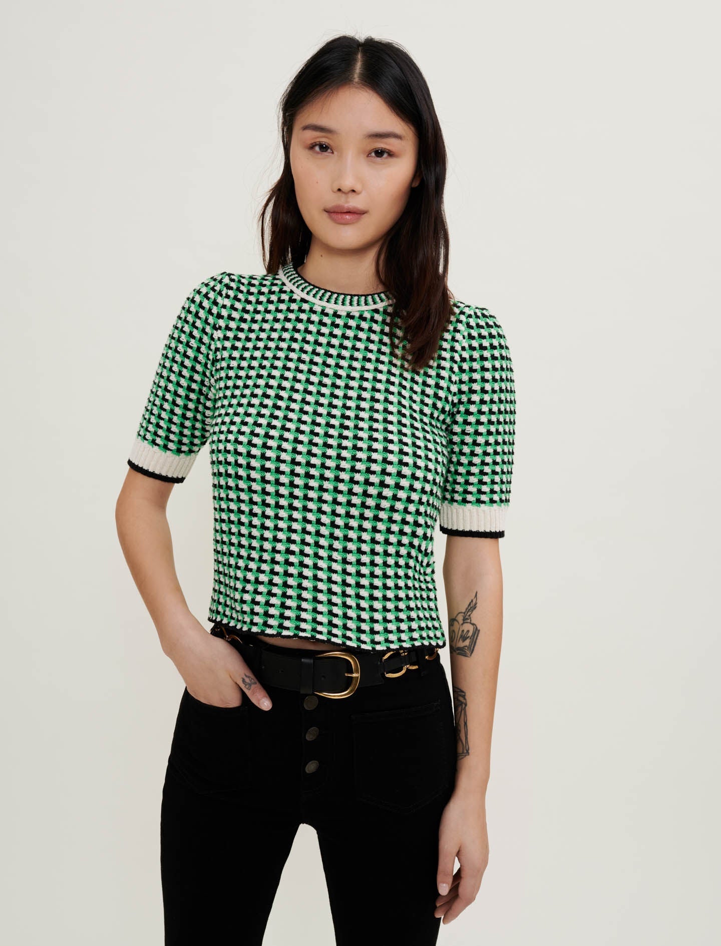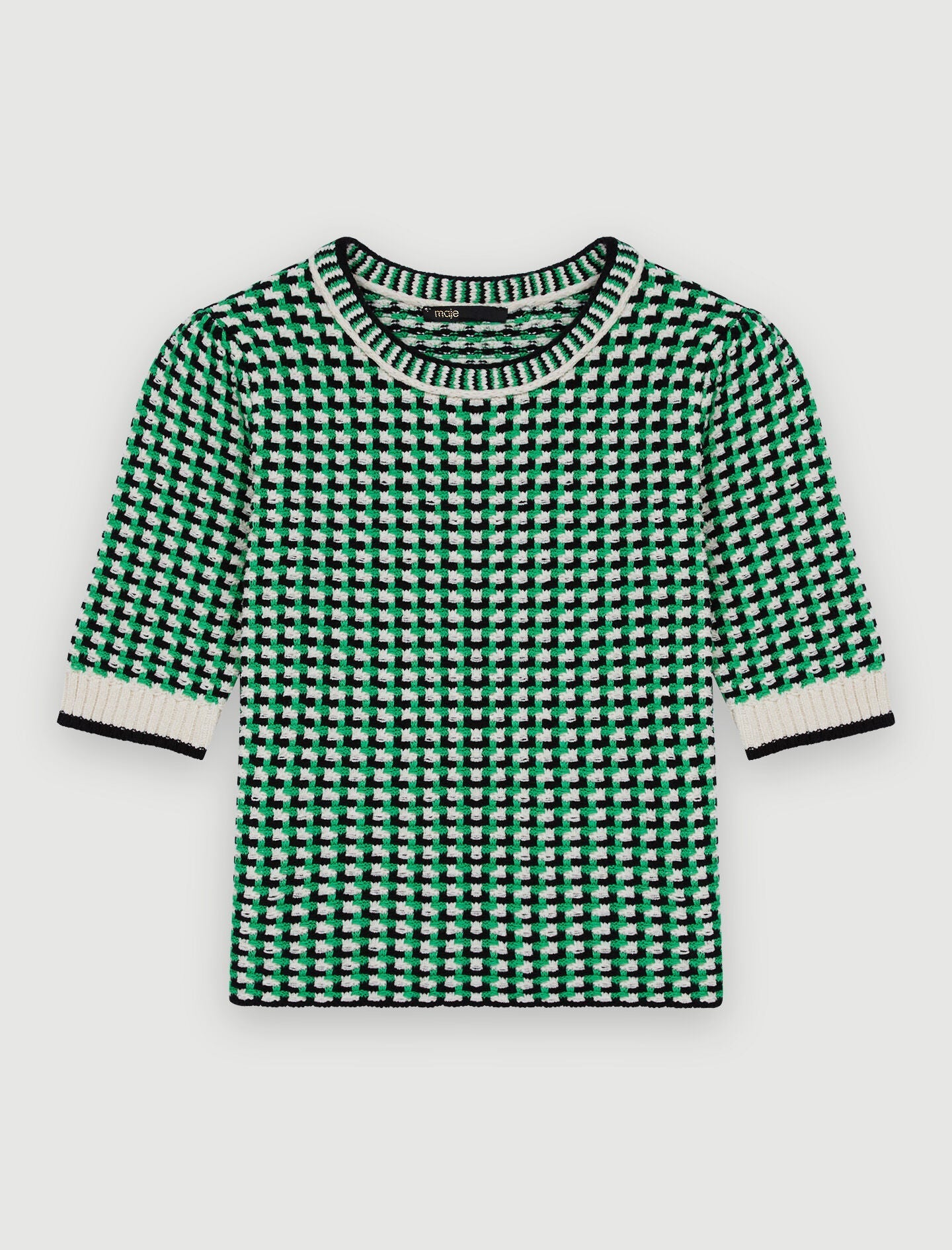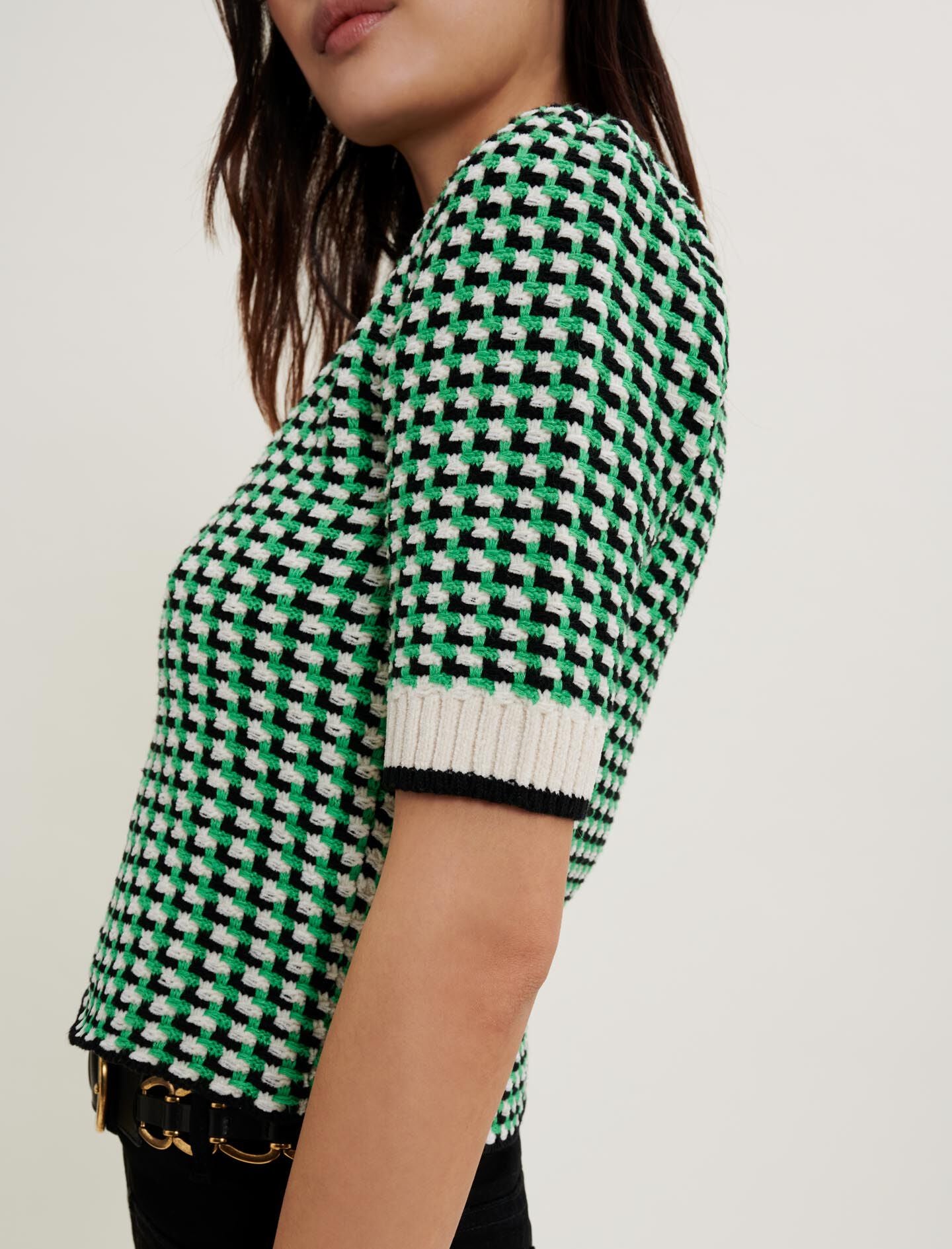 Slightly close-fitting jumper. Decorative green, tweed-effect knit. Short, straight sleeves. Round neckline. Contrasts on the collar and sleeves. Can be worn with the MANELANNE cardigan to complete the look.