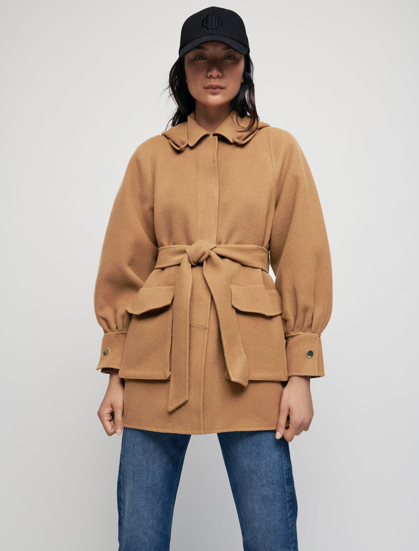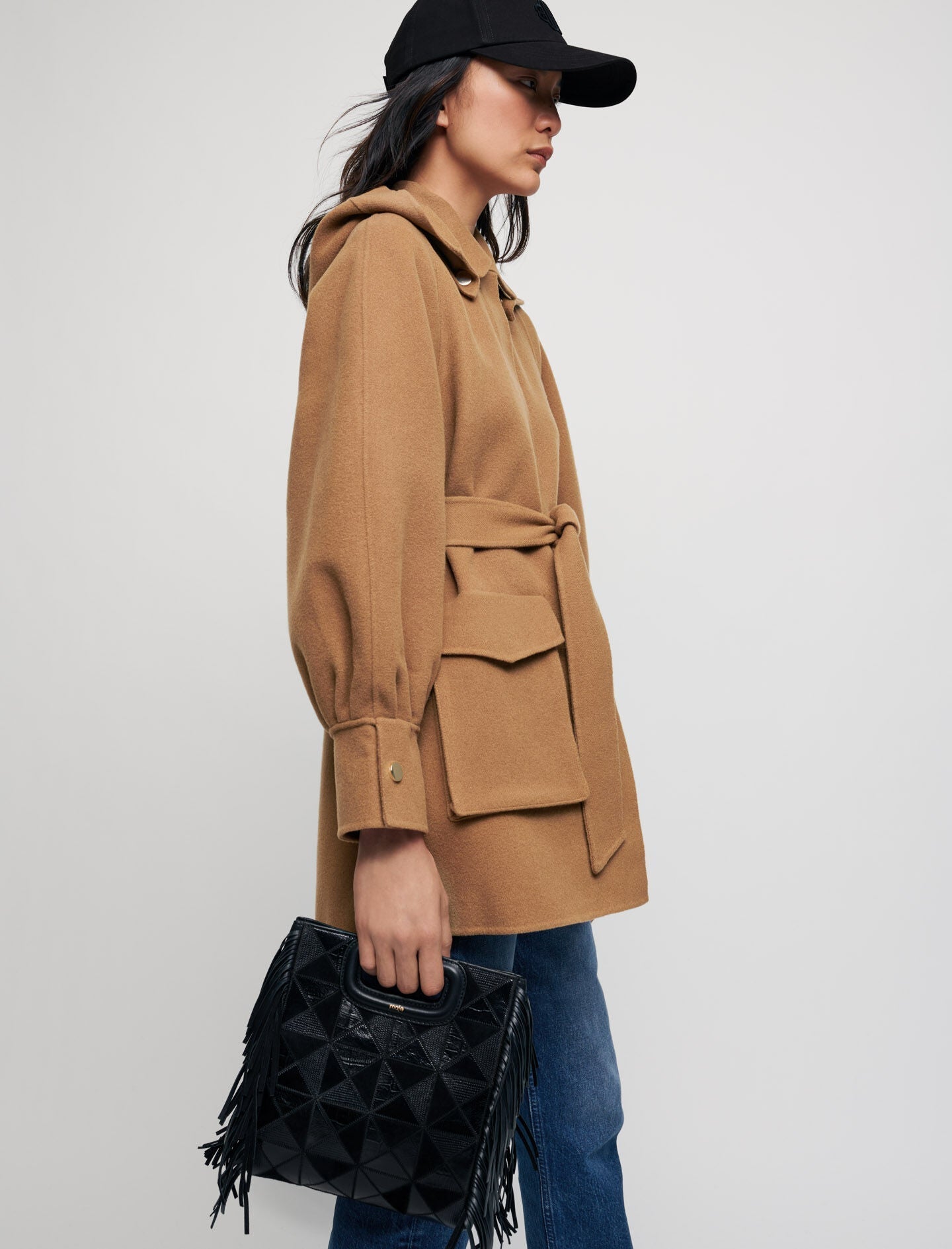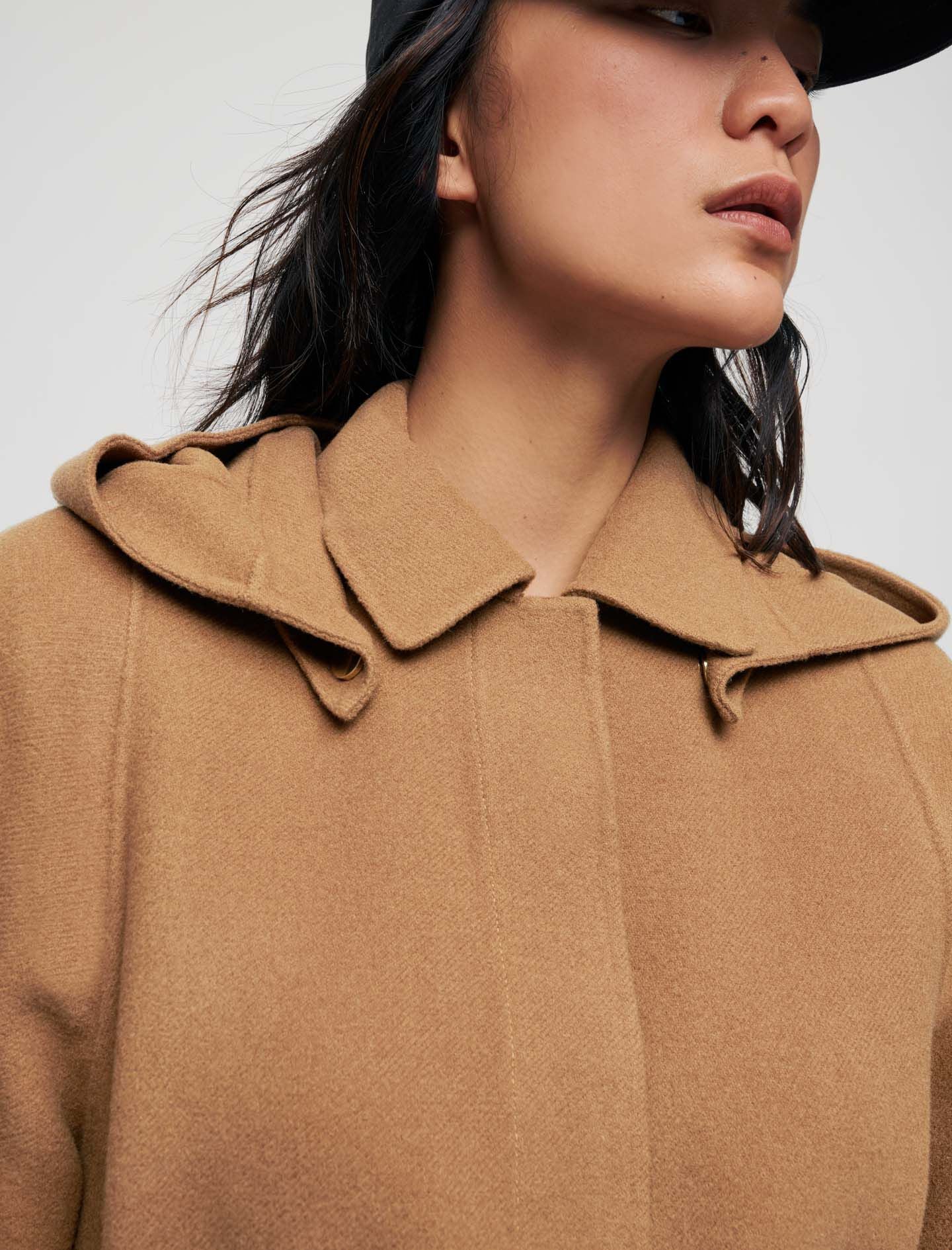 Mid-length, straight, double-faced wool and nylon coat. Long, loose-fitting sleeves with buttoned cuffs. Removable hood. Large patch flap pockets on the front. Removable belt with loops at the waist. Concealed metal buttons on the front.