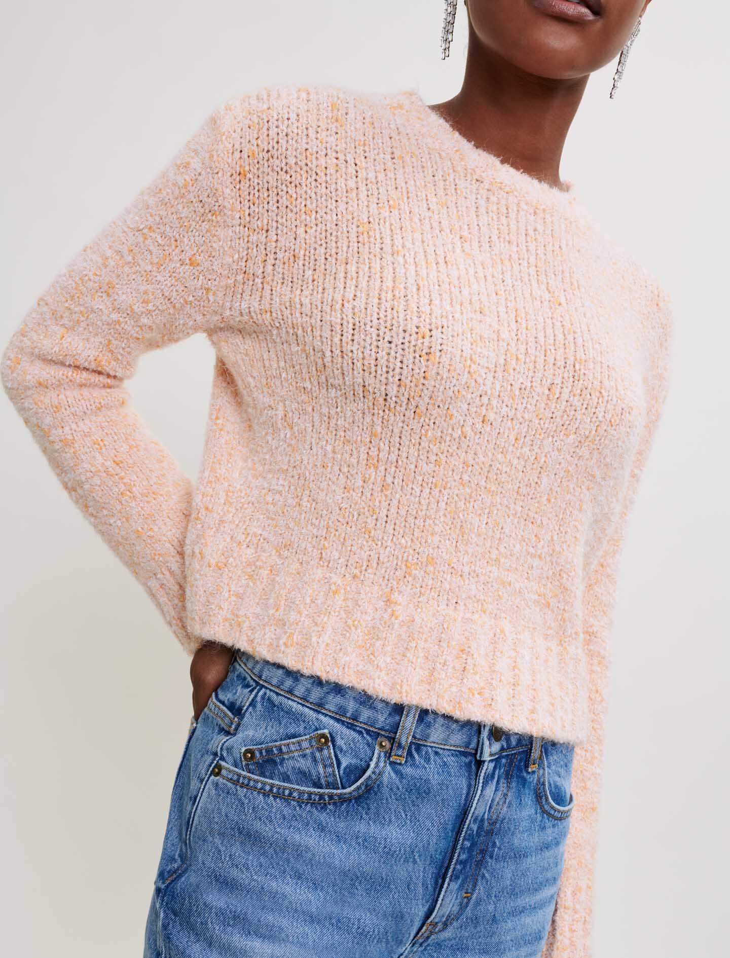 Short, straight sweater. Long, straight sleeves. Fancy knit. Ribbed detail on the collar, cuffs and bottom of the sweater. Round neckline. Can be worn with the PIE pants.