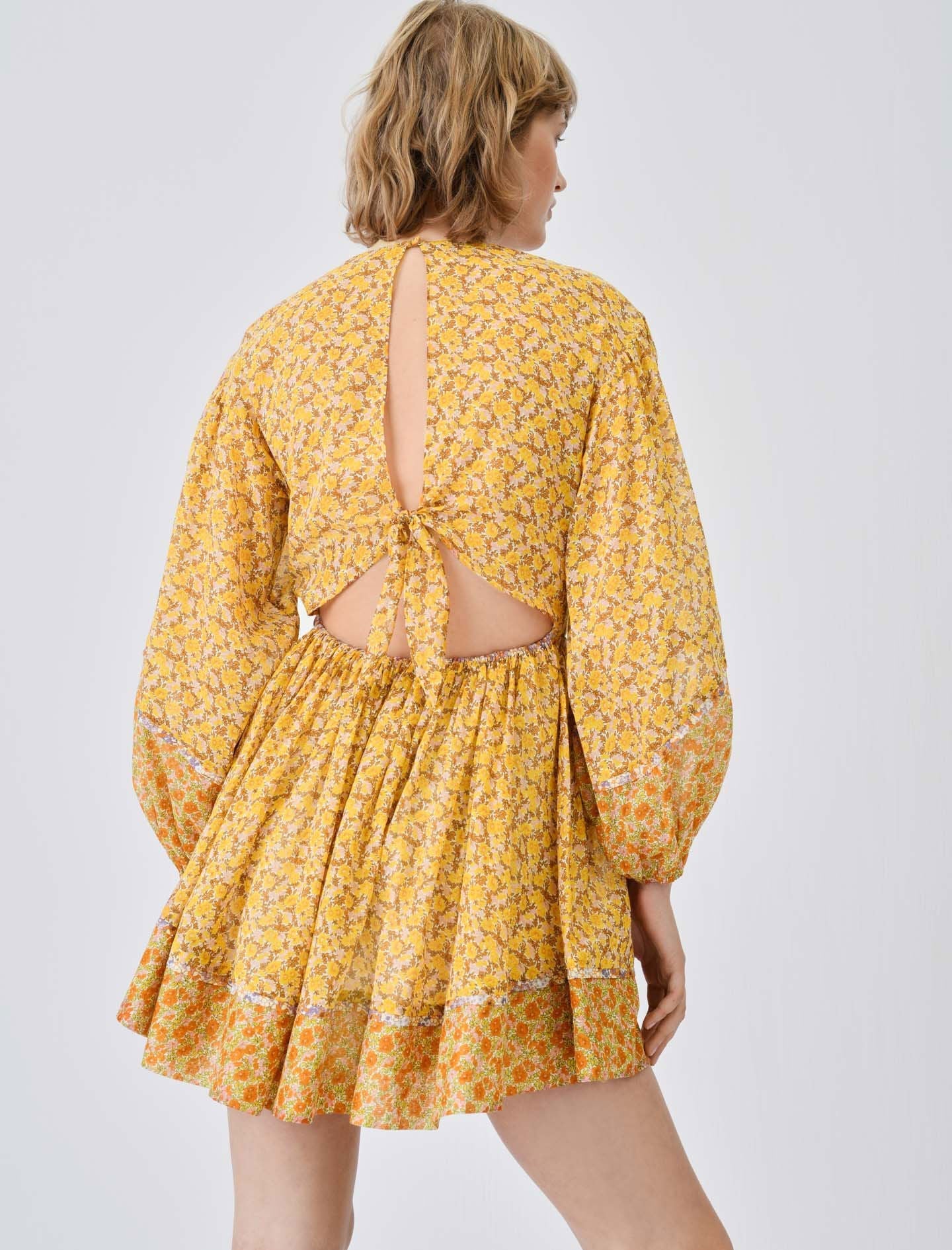 Floaty, loose-fitting ultra-mini dress with mixed small floral prints. Long, floaty, loose-fitting sleeves, elasticated at the bottom. Round neckline. Cotton lining. Opens at back with a small covered button at top and a bow. Elasticated waist. Contrasting piping.