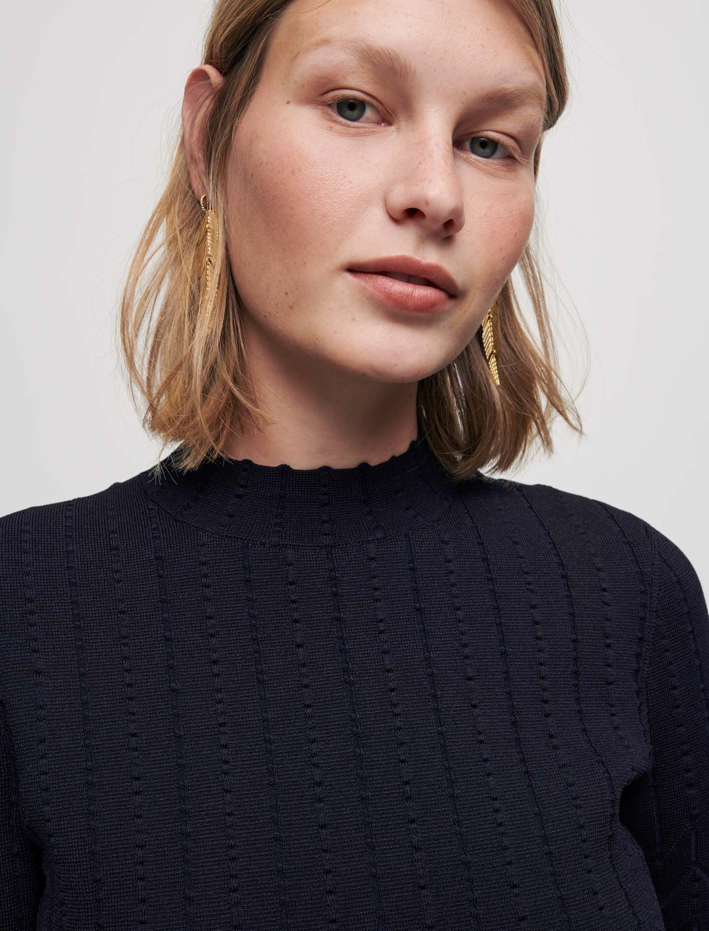 Geometric knit fancy skater dress. Short, fitted sleeves. Stand-up collar. Zip in the back.