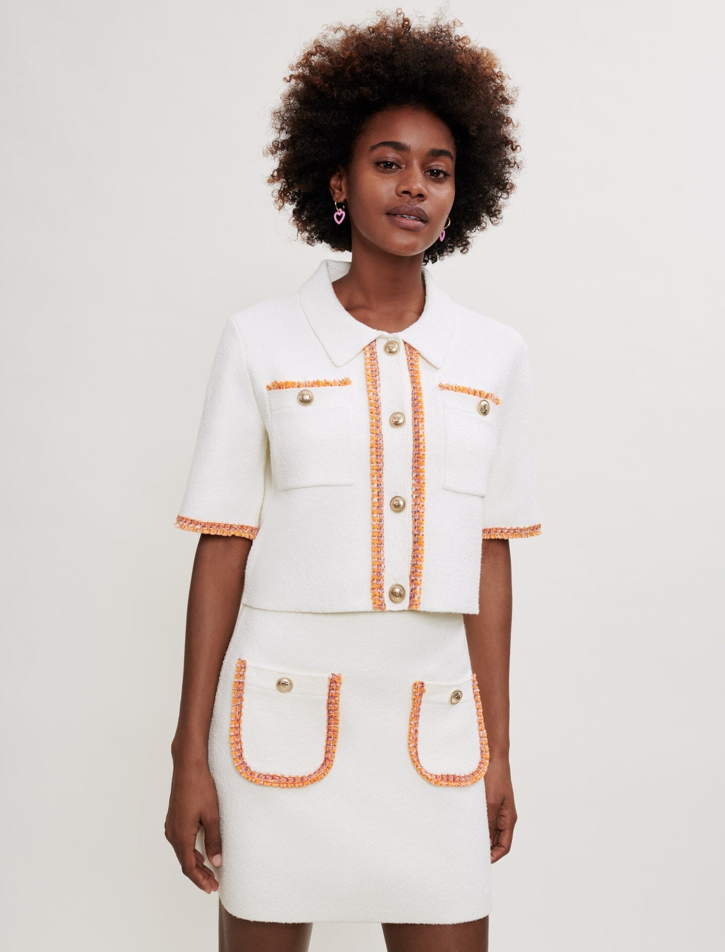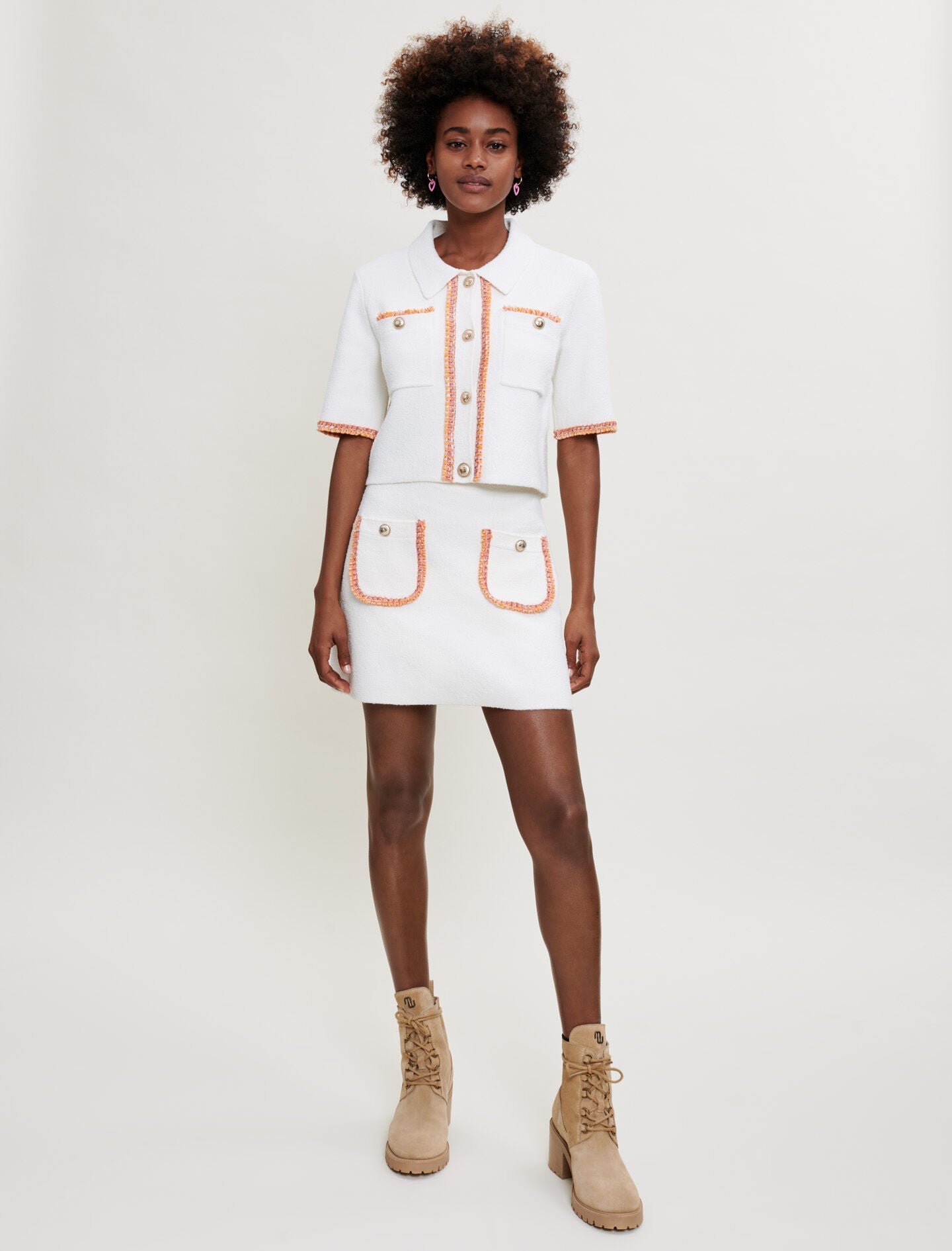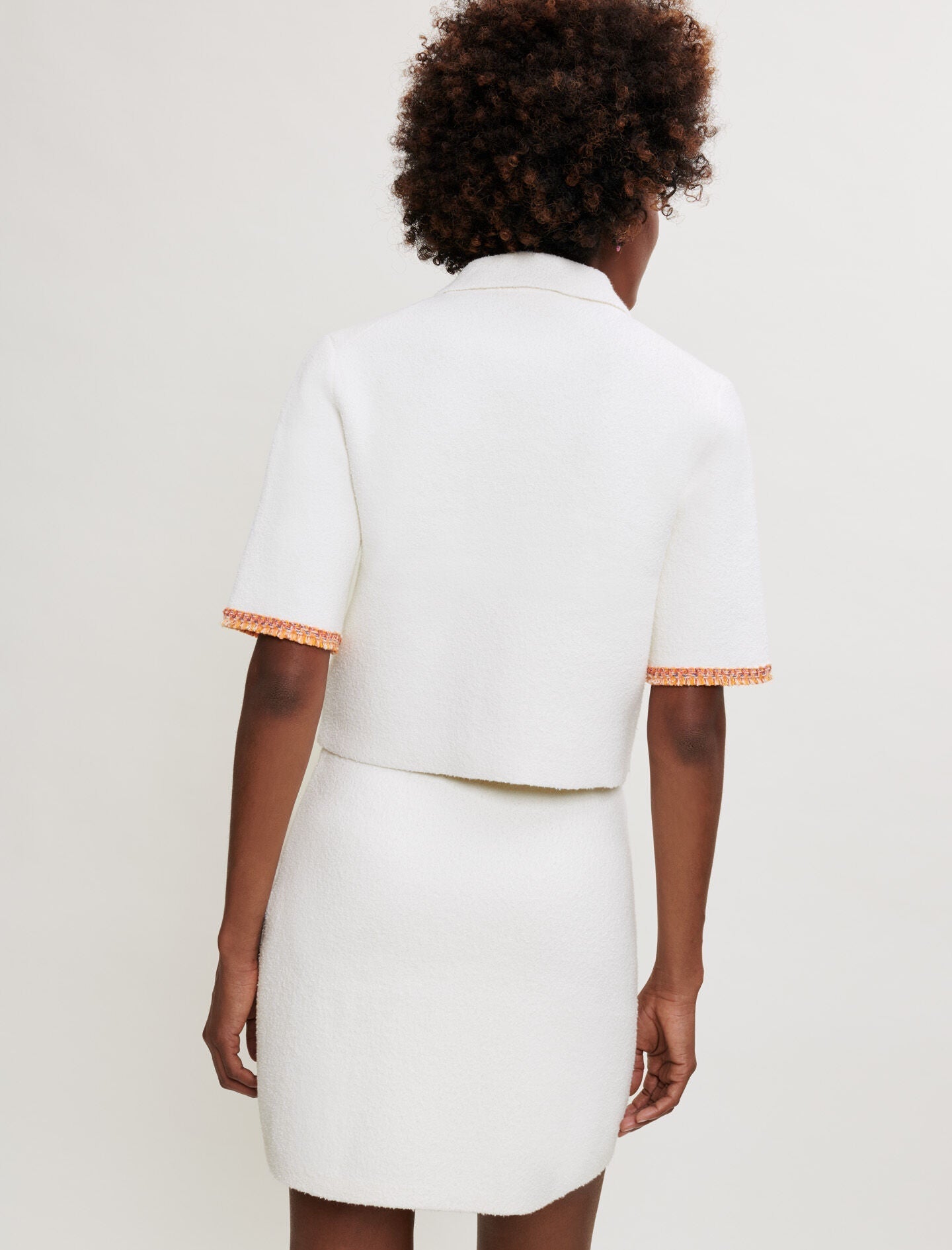 Short, loose ecru non-stretch knit cardigan. Short, straight sleeves. Fringing on the front pockets and ends of sleeves. Metal buttons with the Maje logo. Two patch pockets on the chest. Can be worn with the JISAL skirt.
