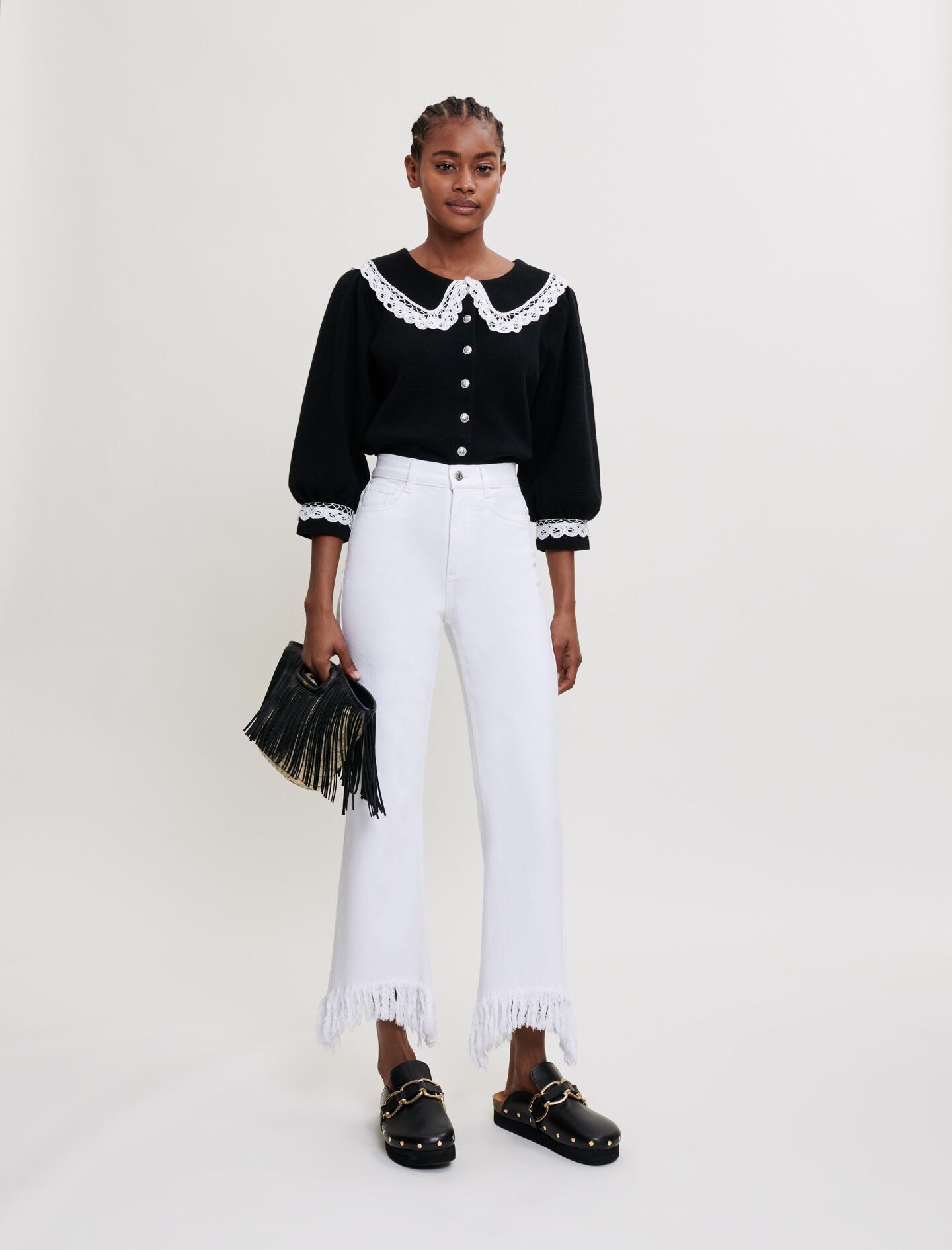 Short, loose-fitting cardigan. Slightly stretch, plain-coloured knit fabric. Mid-length, loose-fitting sleeves, tightened at the bottom. Large collar. Jewelled buttons on the front. Embroidered trims on the collar and at the bottom of the sleeves. Can be worn with this season’s jeans.