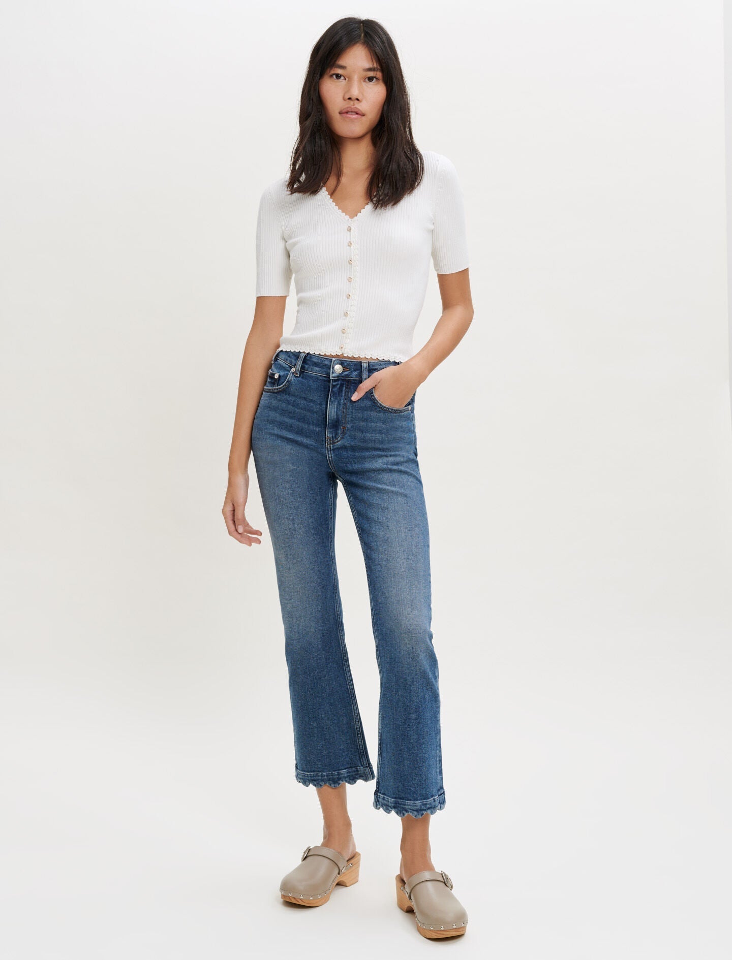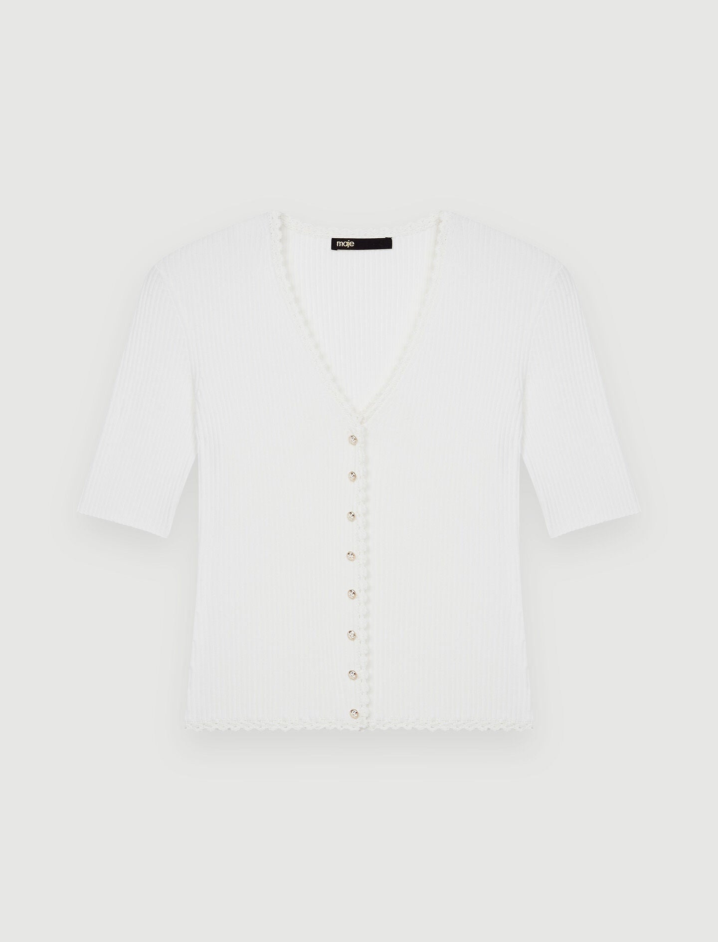 Short, close-fitting pullover. Stretch finely-ribbed knit. Short, fitted sleeves. Slightly low-cut round neckline. Decorative metal buttons on the front. Rickrack finishing around the edges of the garment and on the cuffs.