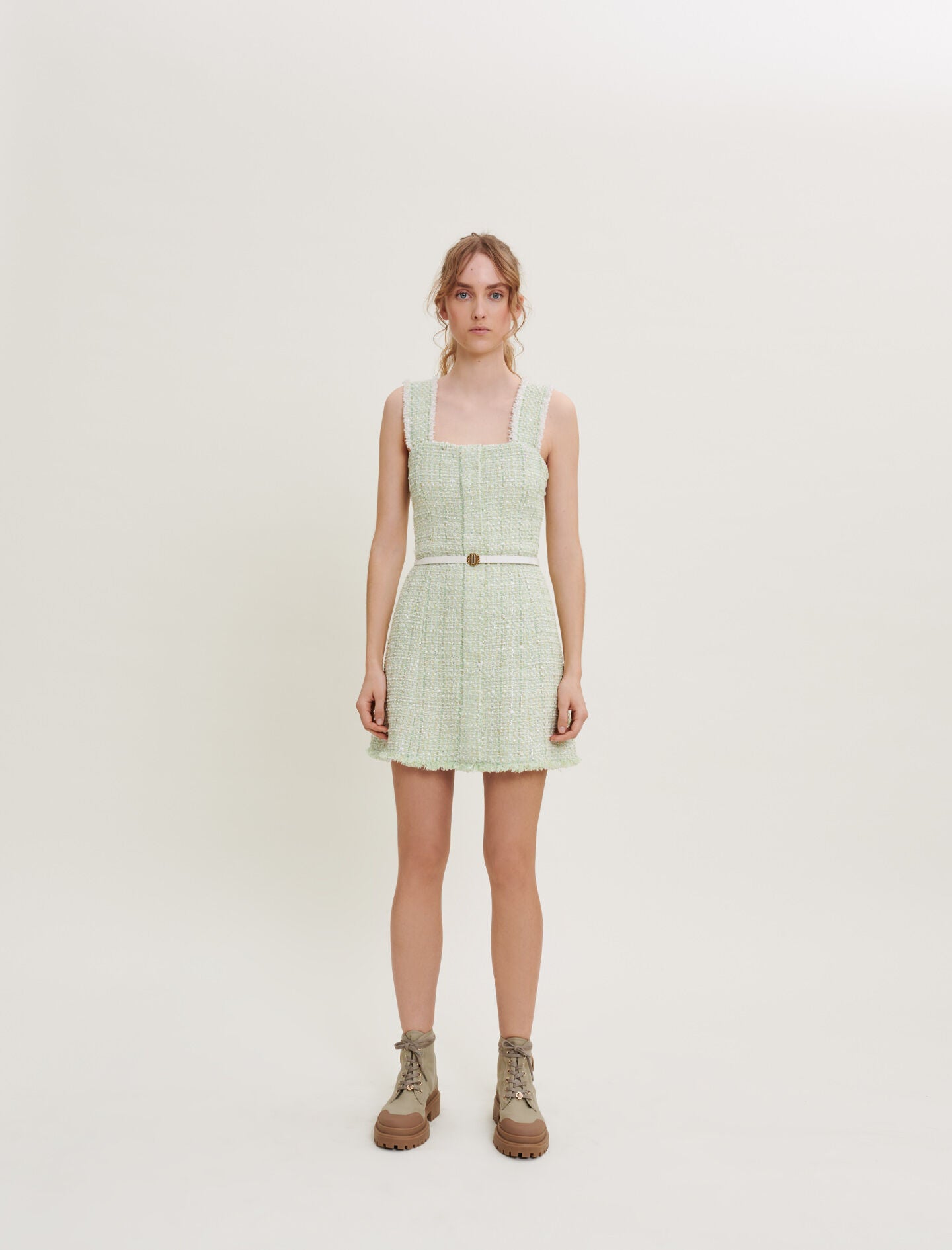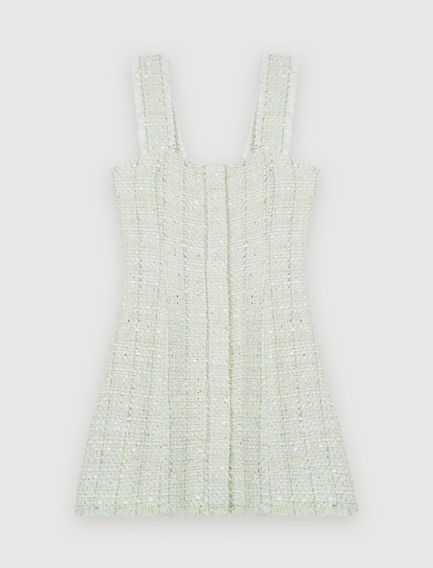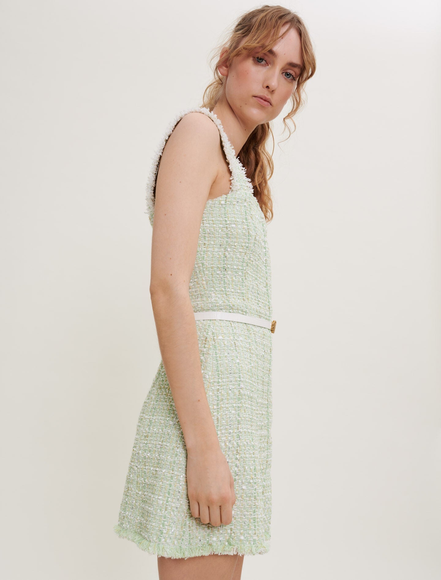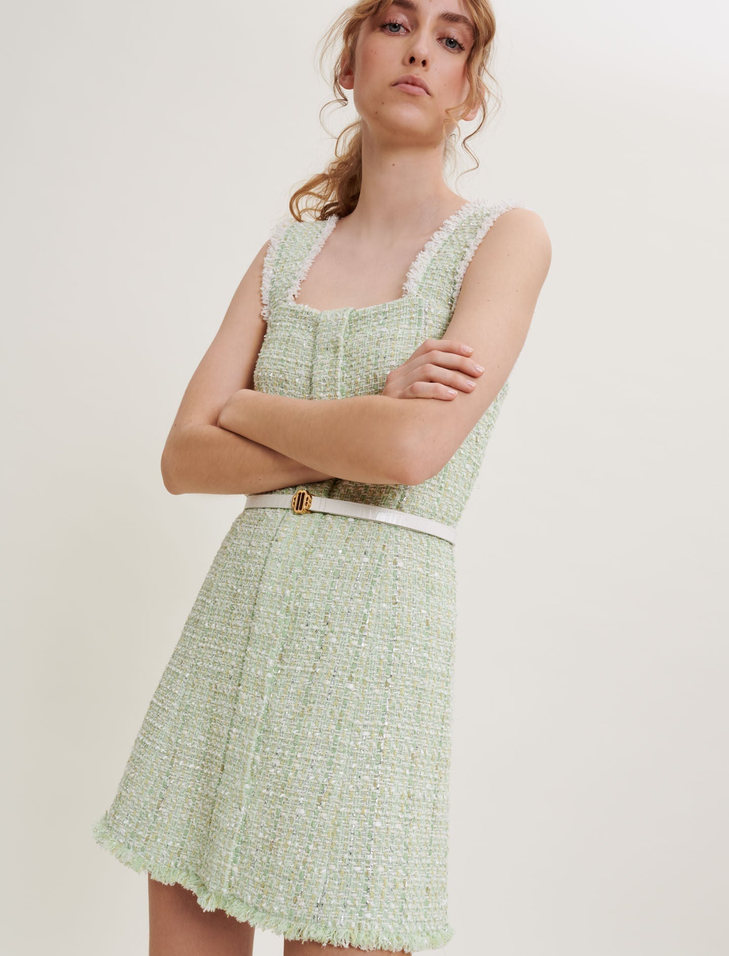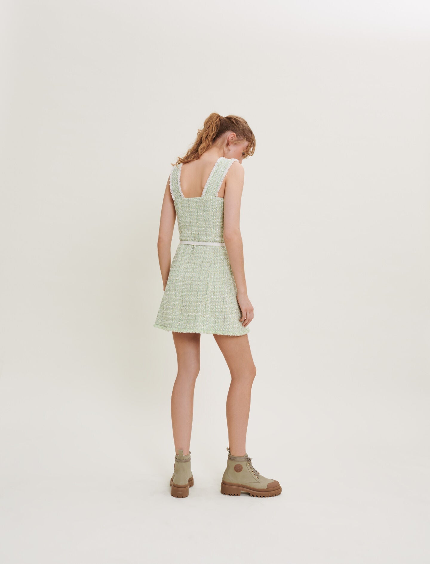 Short dress, cinched at the waist. Plain green tweed with metallic fibers. Wide straps. Square, low-cut neckline. Fringes on the straps and on the hem. Invisible side zip.