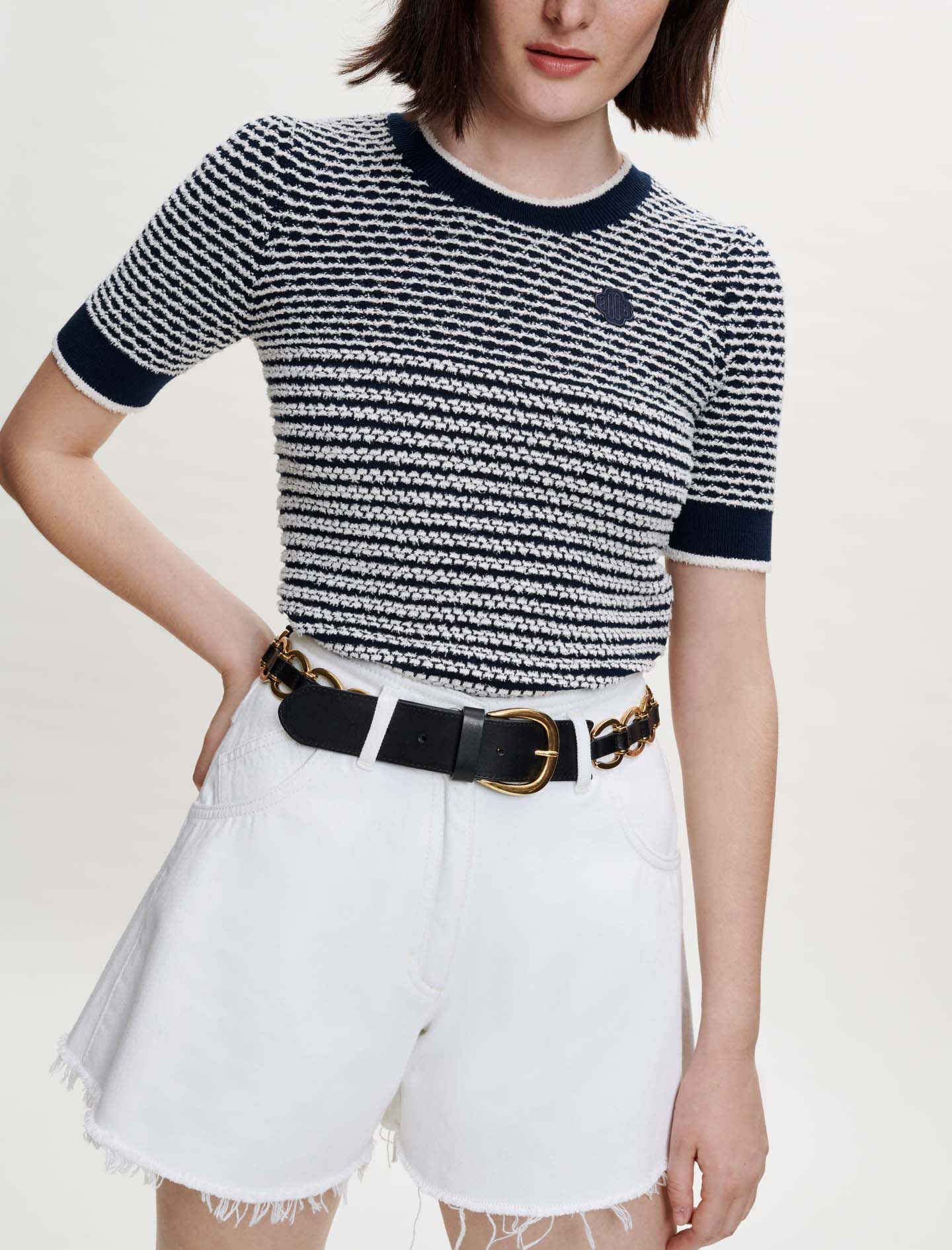Close-fitting pullover with sailor-style contrasting stripes. Cotton blend knit. Short, fitted sleeves. Monogram patch.