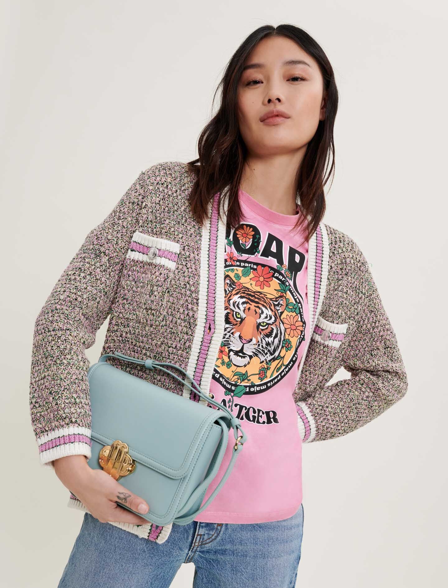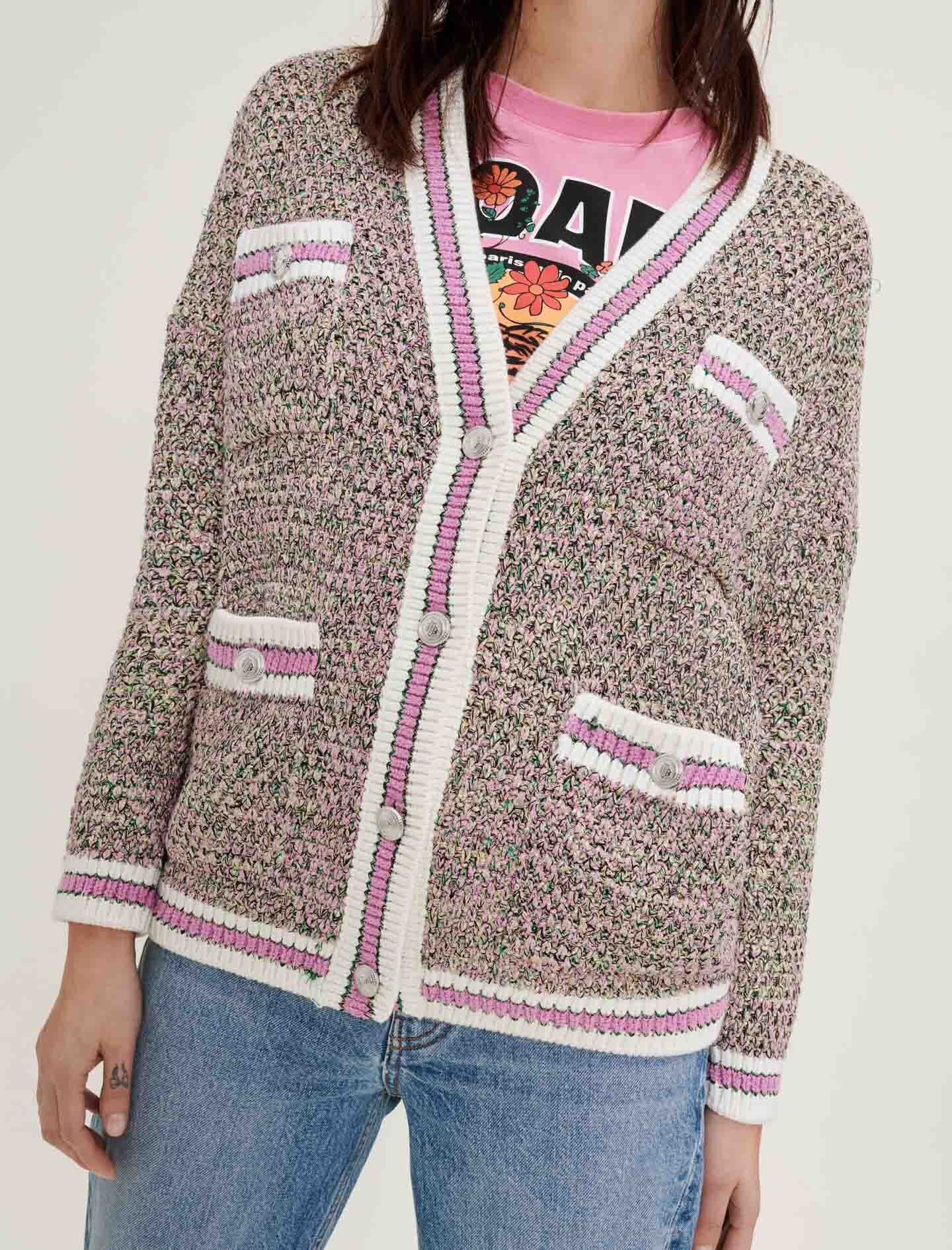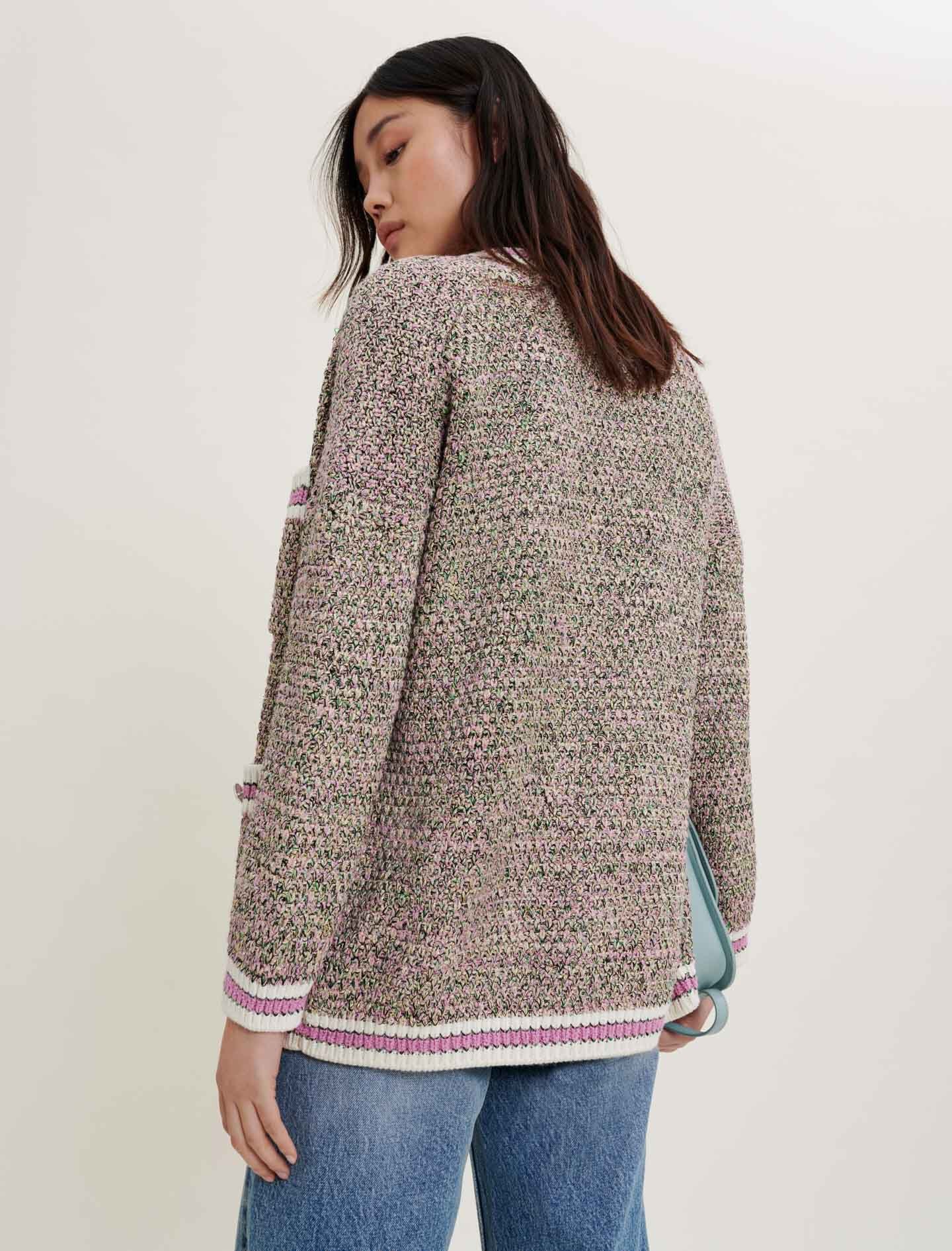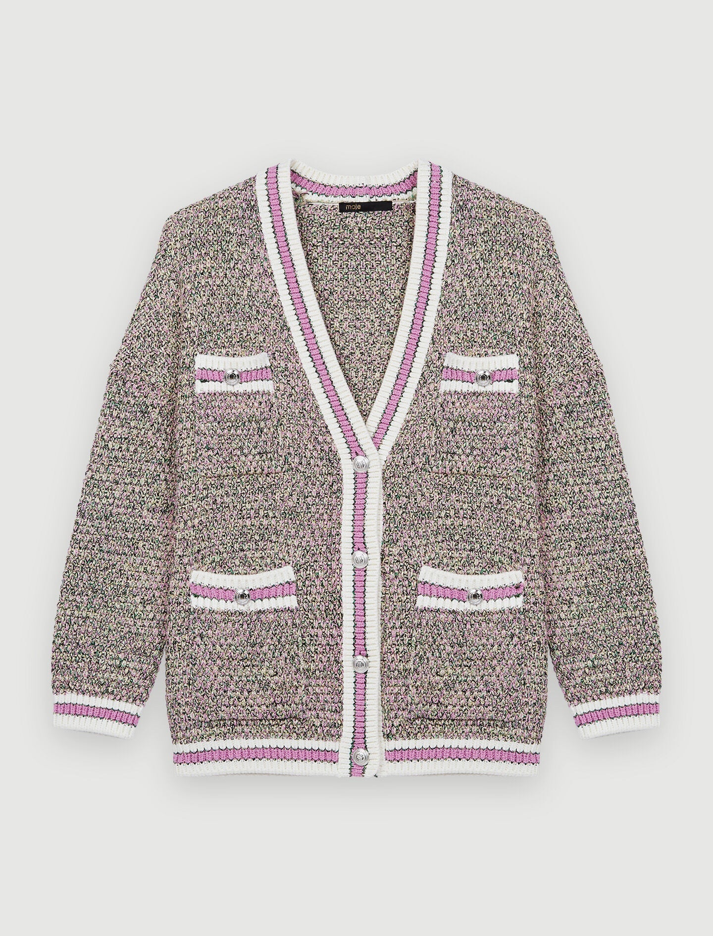 Mid-length, loose-fitting cardigan. Decorative knit fabric with a shiny finish. Long, straight sleeves. V-neck. Four pockets on the front. Metal buttons with the Maje logo. Contrasting bands on the front pockets and at the bottom of the sleeves.